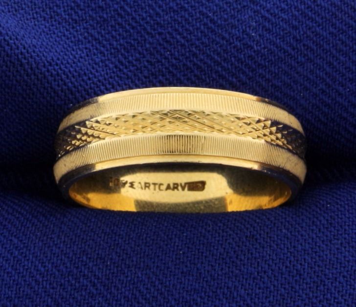 In 14k yellow gold. 6mm wide with interesting pattern. Size 7 1/4. 4.7g.