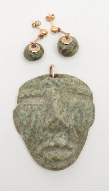 Woman’s jade pendant and jade earrings showing what appear to be considerable age; pieces from Mexico, pendant is approx. 2-1/2” x 2-1/4” with the earring jade rounds approx. ½” x 3/8” each. Est.: $150-$300.