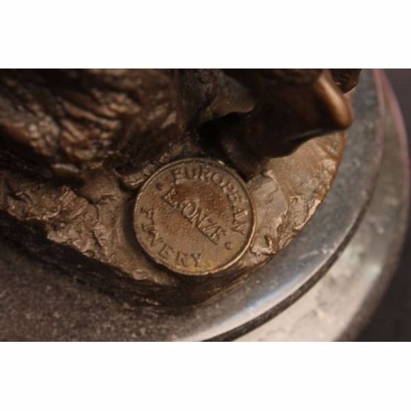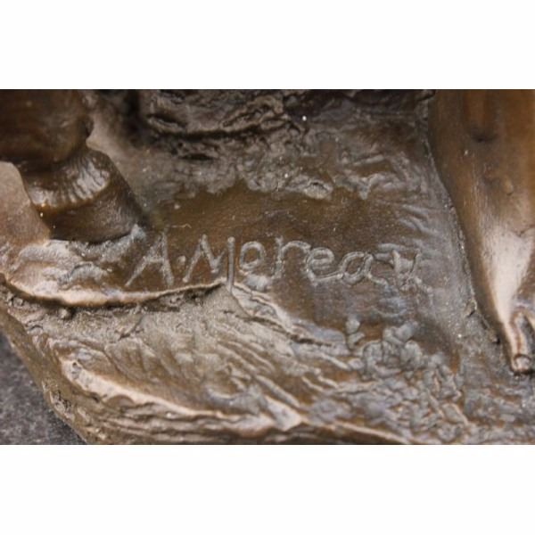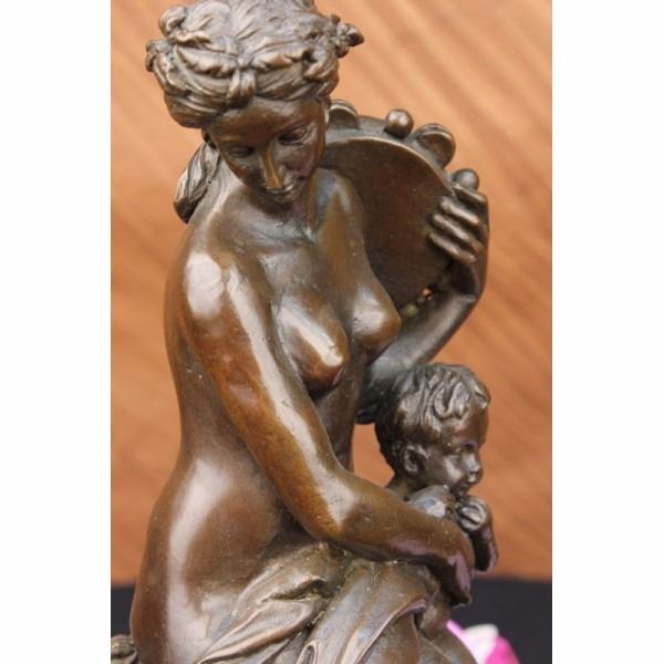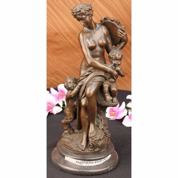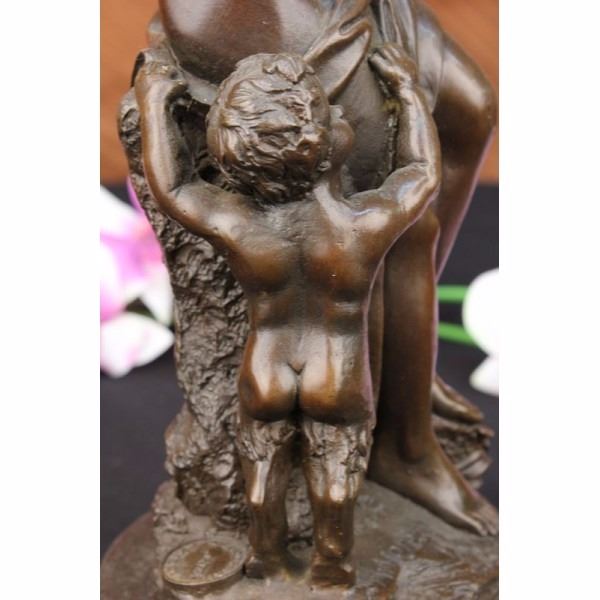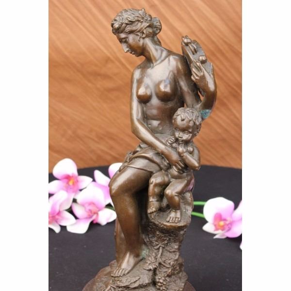 The bronze sculpture, rich in Greek mythological lore, shows a beautiful nude maiden and two child figures. She sits upon a stone with a fabric robe twisting around her lower torso. Her hair is entwined in beautiful braids as she looks down at the young satyr, the half goat and half man creature, that pulls at her lap. Her right hand sweeps across her elegantly to hold on to a human child as her left hand holds a tambourine. The sculpture was cast using the archaic method of lost-wax casting and stained with a brown patina finish for preservation. It is mounted upon a black marble base with the artist Mayer's signature. Condition: This sculpture is in perfect condition. Bronze Dimensions with Marble Base:Height 13" x Width 7" Marble Dimensions: Diameter 5 1/2". Height without base: 12" Weight : 10 LBS Inventory : 27X07904872