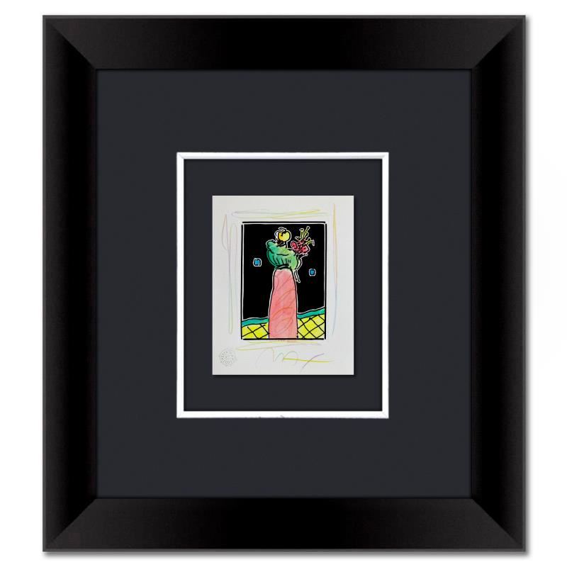 "Woman with Flowers" is a one-of-a-kind mixed media on paper, hand signed by Peter Max. The piece comes custom framed with a backside cutout to display Peter Max Studio registration number 372569 certifying authenticity. Measures approximately 23" x 21" (frame), 9" x 7" (image).