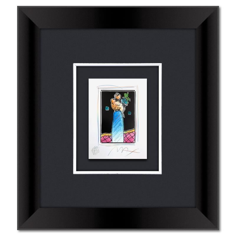 "Woman with Flowers" is a one-of-a-kind mixed media on paper, hand signed by Peter Max. The piece comes custom framed with a backside cutout to display Peter Max Studio registration number 372530 certifying authenticity. Measures approx. 22.5" x 21.5" (frame), 8" x 6" (image). This item requires special handling and may have a longer than usual turnaround.