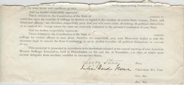 Rare 1871 bottom portion of document signed from the Womans Suffrage Association signed by its leaders of the movement Stone, Howe and Grew.