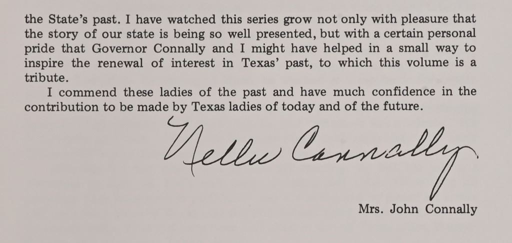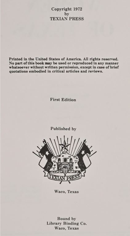 Published 1972 by Texian Press, Limited Edition #37/50 Autographed by Mrs. John Connally, James M. Day, Billy Mac Jones, Dayton Kelley, Martha Ann Turner, John French, W.C. Nunn, Rupert N. Richardson, Harold B. Simpson and Dorman H. Winfrey. Comes in book slip case.