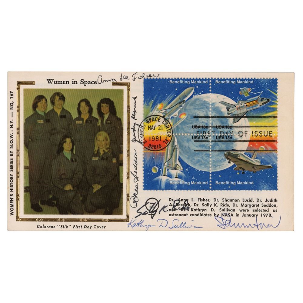 FDC with a silk cachet honoring women in space, signed in ink by six pioneering female astronauts: Sally Ride, Judy Resnik, Rhea Seddon, Anna Lee Fisher, Kathryn Sullivan, and Shannon Lucid. In very fine condition.