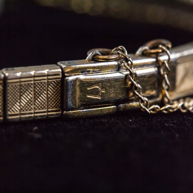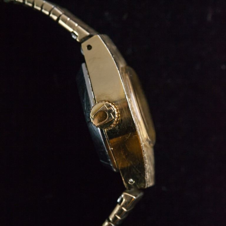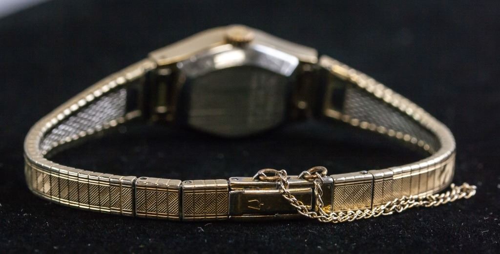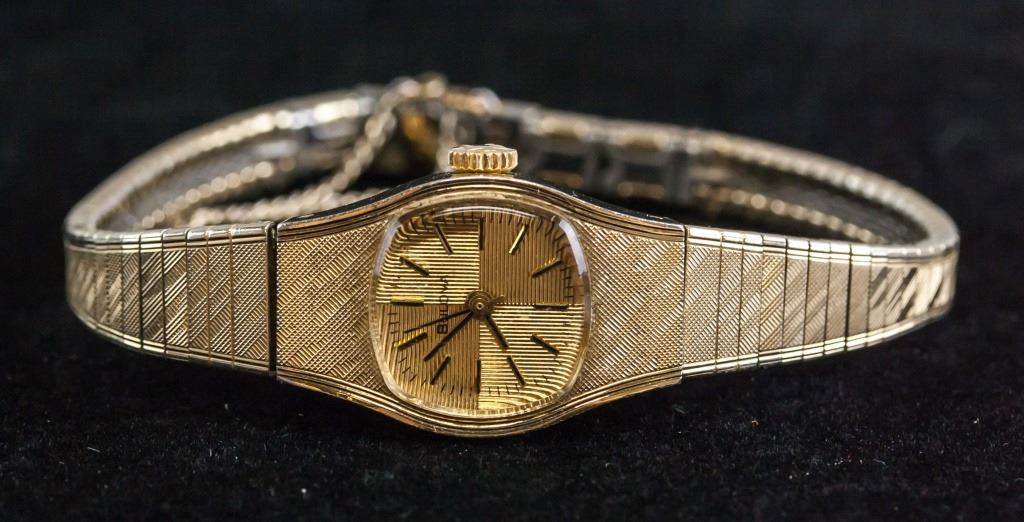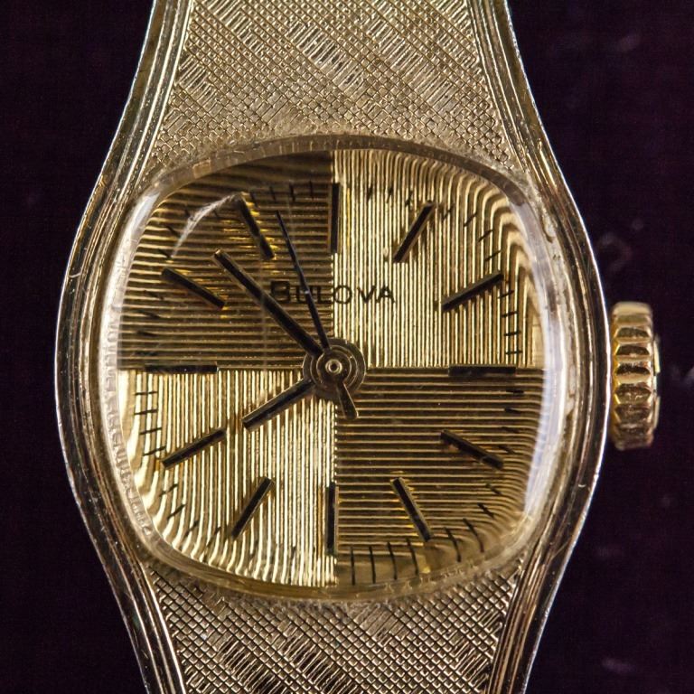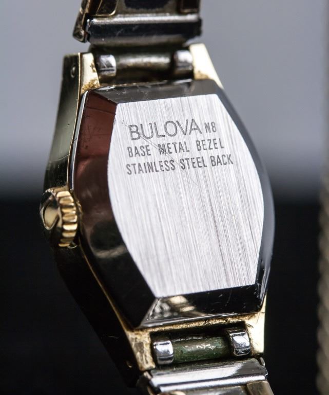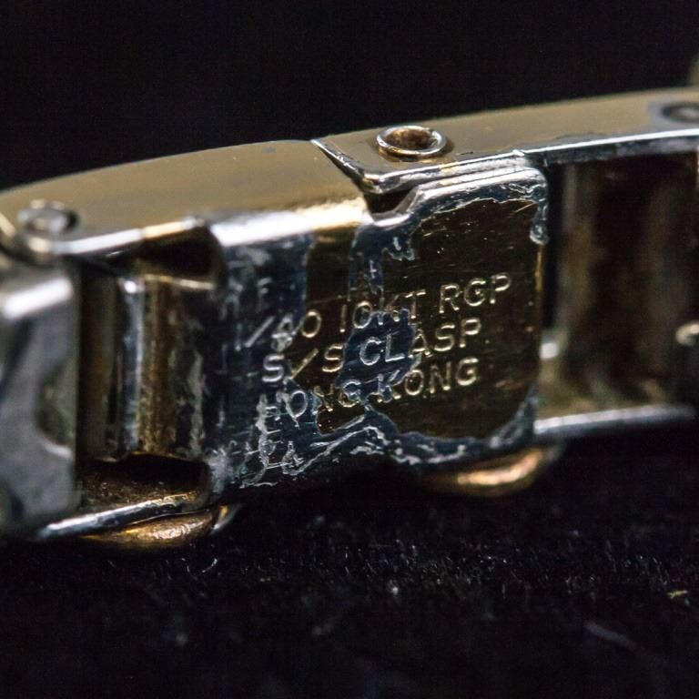 Women's watch. Gold colored. "BULOVA" on watch face. "BULOVA N8 / BASE METAL BEZEL / STAINLESS STEEL BACK" inscribed on back. "... 10KT RGP / S/S CLASP HONG KONG" inscribed on watch clasp. Overall length: 10 cm. Face: 1.5 cm.