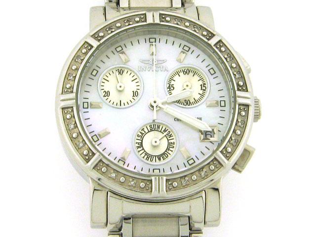 This is an Invicta Women's 4718 II Collection Limited Edition Diamond Chronograph Watch with the following features: bezel ringed with 16 hand set sparkling diamonds; mother-of-pearl dial face with three silver sub-dials with measurements for 1/10th of a second, 60 seconds, and 30 minutes of elapsed time as well as luminous Tritnite hands and hour markers, small minute indexes, and a date window at 4 o'clock; case diameter measures 33mm wide (1.30 inches) and case thickness is 11mm (0.43 inches); stainless steel bracelet band; Swiss quartz movement; scratch-resistant sapphire crystal; and water resistance to 100 meters (330 feet).