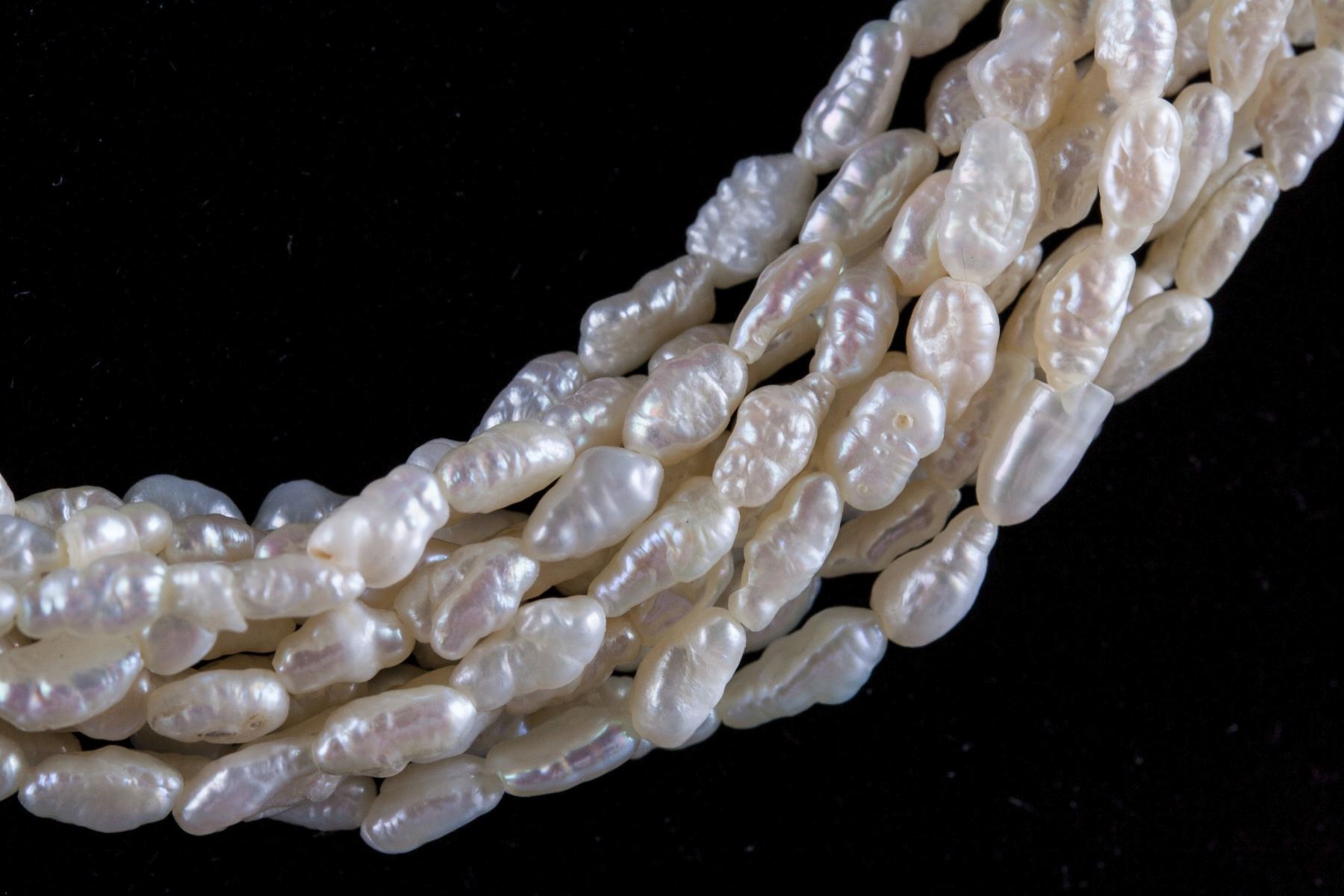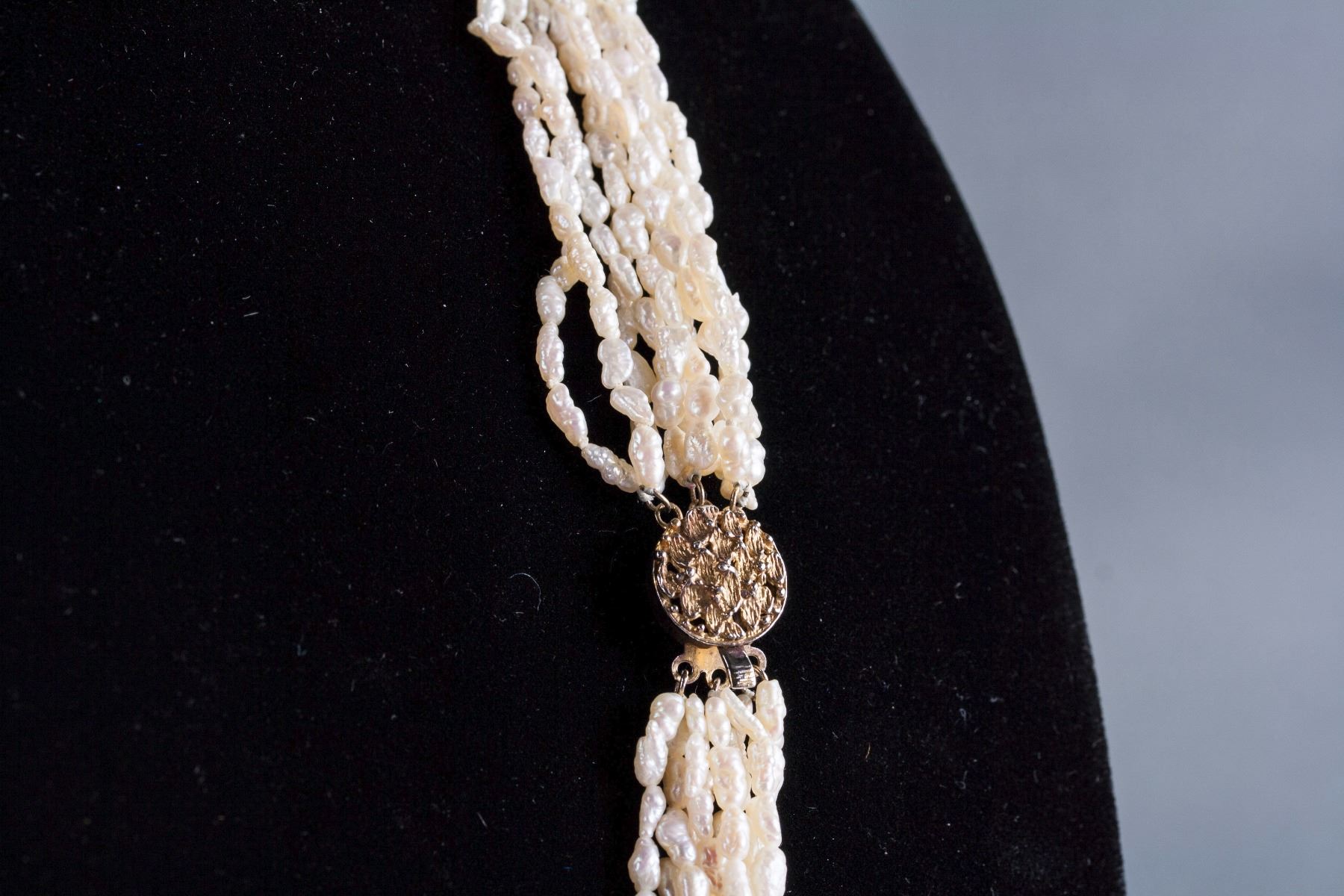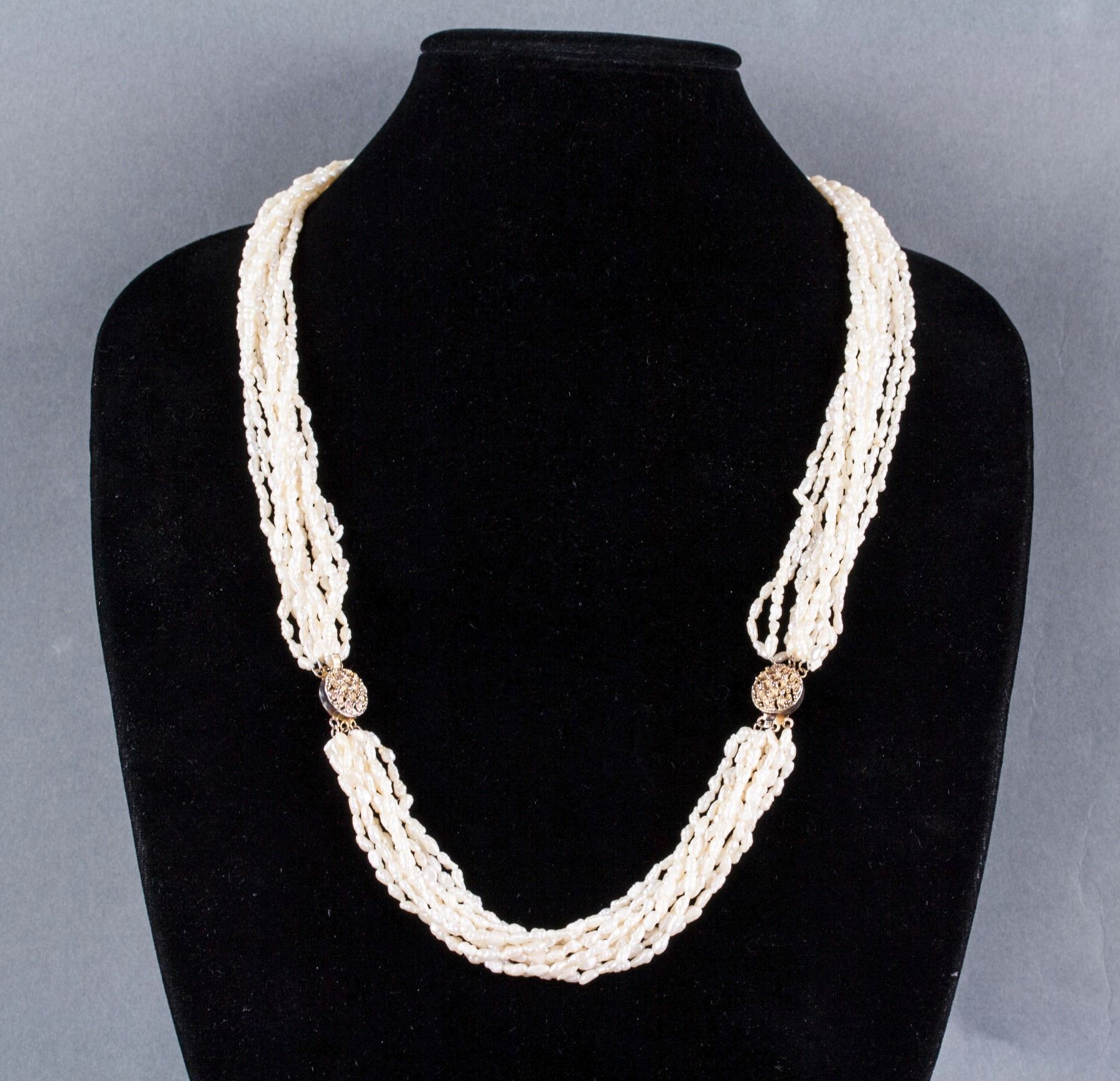 women's pearl necklace; of 10 strands of natural shape pearl beads; connected by gold tone metal round beads; D: 25 cm, 92 grams