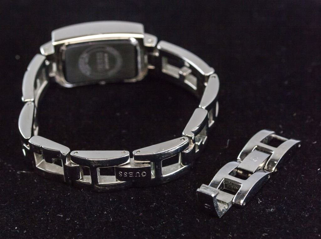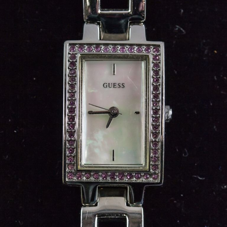 Women's watch. "GUESS" on watch face. Of silver tone with clear stones set around watch face. "GUESS Inc / JAPAN MOV'T / GUESS I80220L4 / WWW.GUESSWATCHES.COM" on back of watch. Overall length: 19 cm. Face: 2 cm.