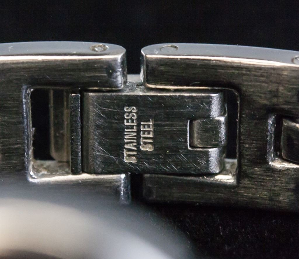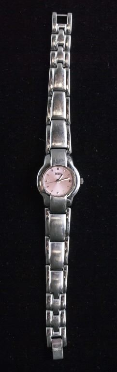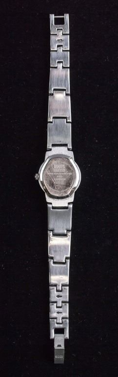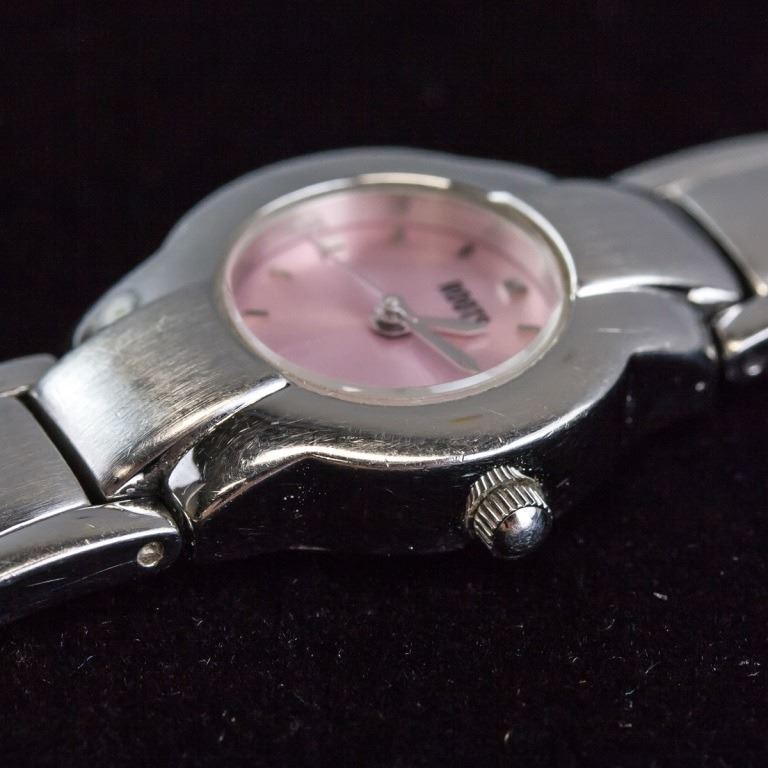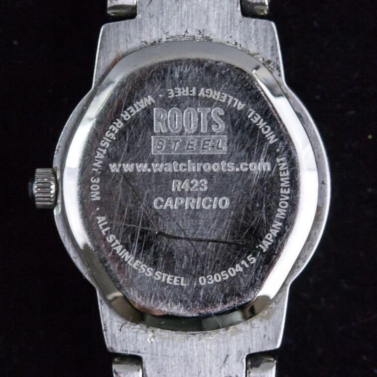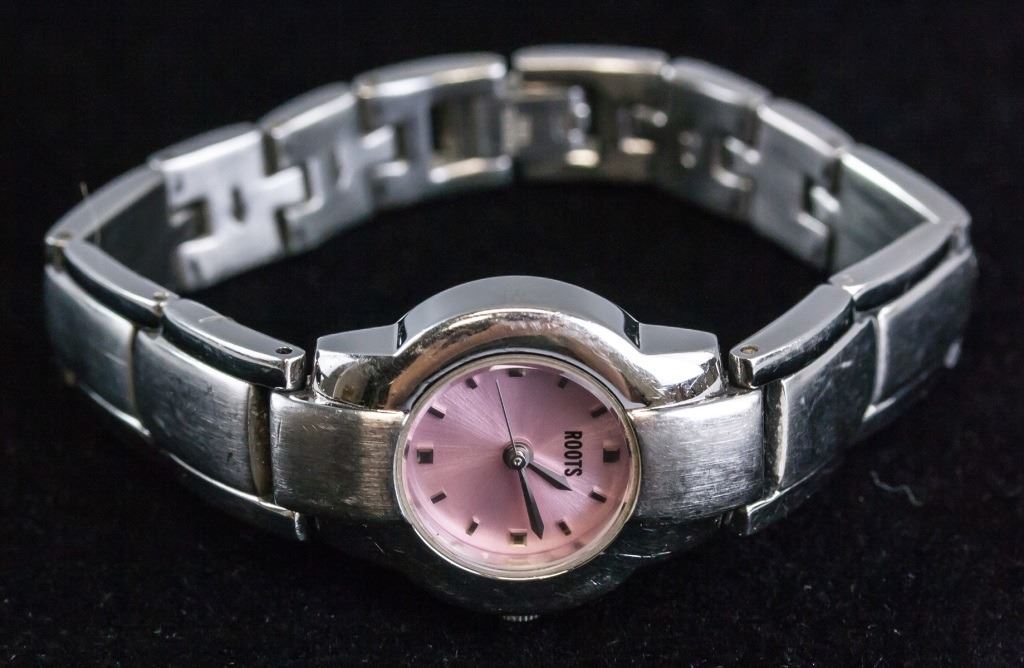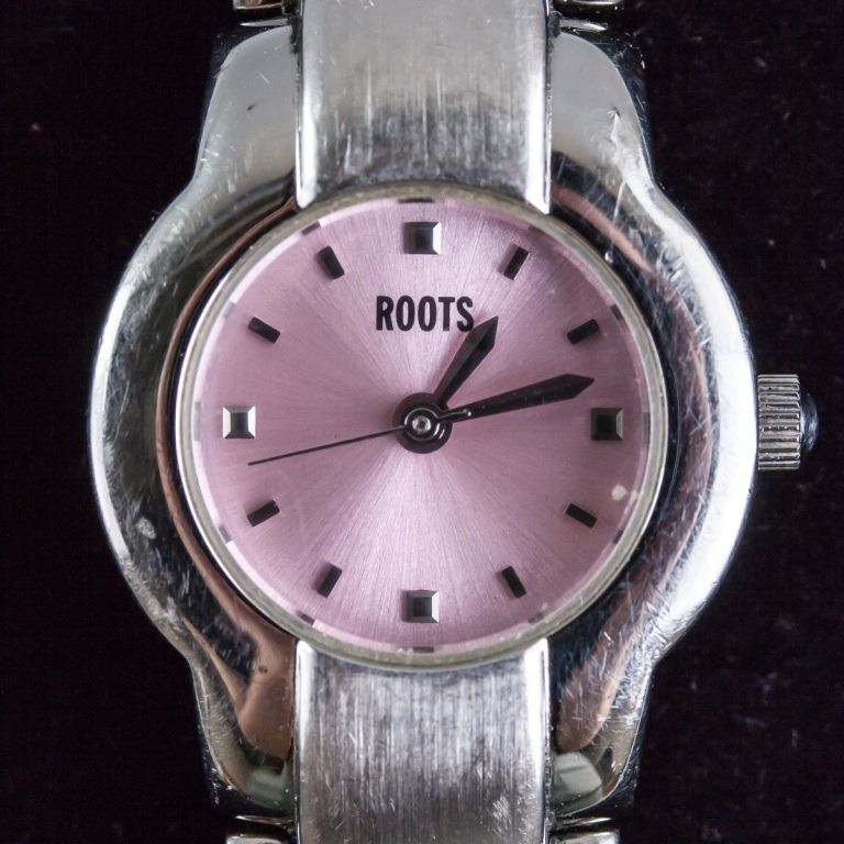 Women's watch. Branded "ROOTS", with small pink face. With silver-toned bracelet band. "WATER RESISTANT 30M / ALL STAINLESS STEEL / 03050415 / JAPAN MOVEMENT / NICKEL ALLGERY FREE / ROOTS STEEL / WWW.WATCHROOTS.COM / R423 CAPRICIO" stamped on back. Overall length: 16 cm. Face: 1 cm.