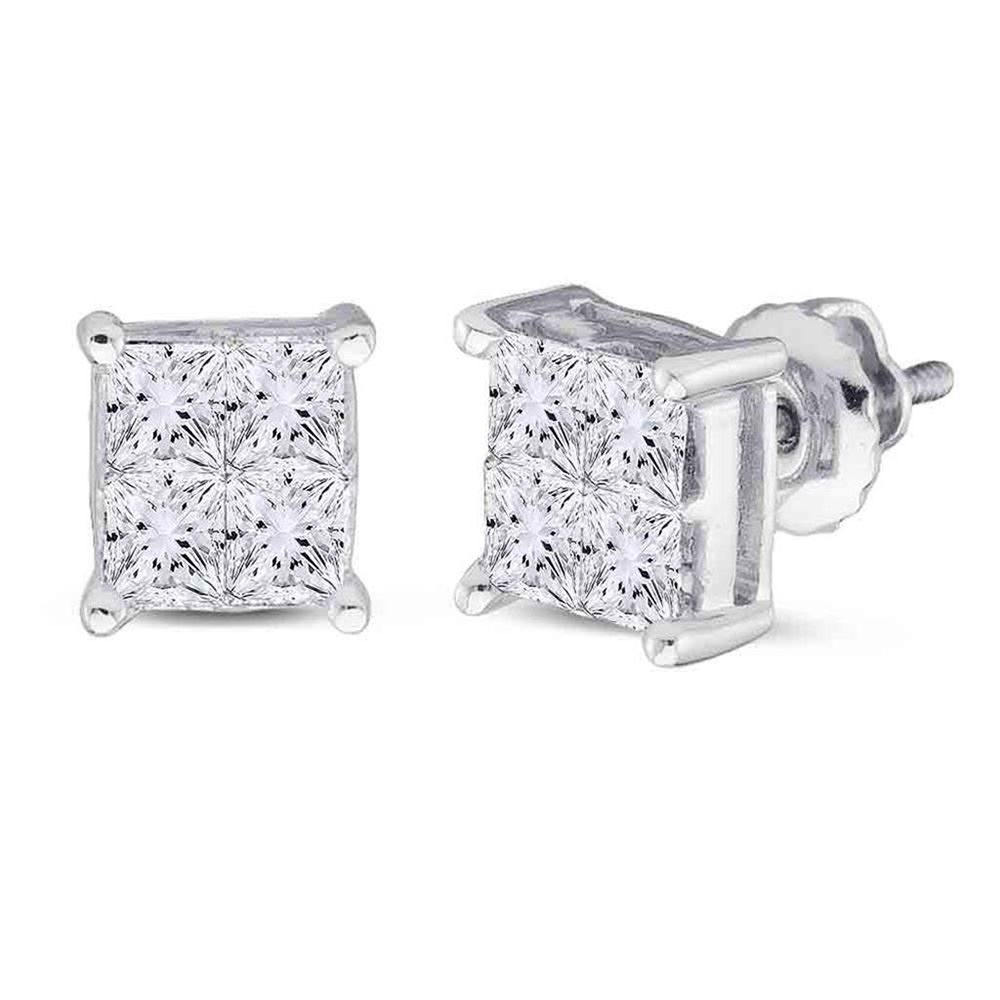 REF-79K5Y ---- Womens Princess Diamond Square Cluster Stud Earrings 1 Cttw 14kt White Gold