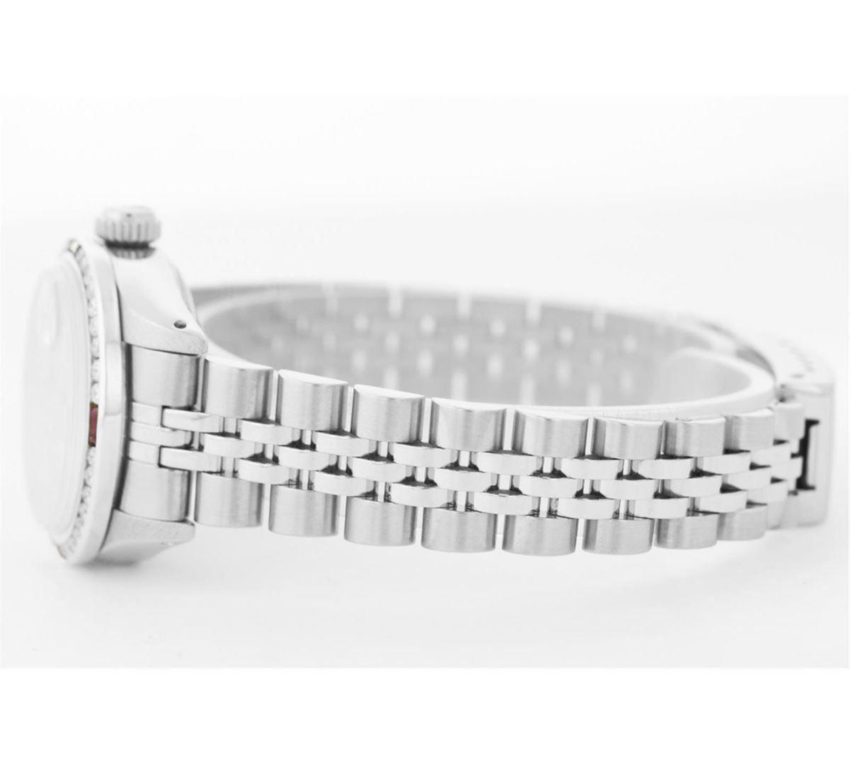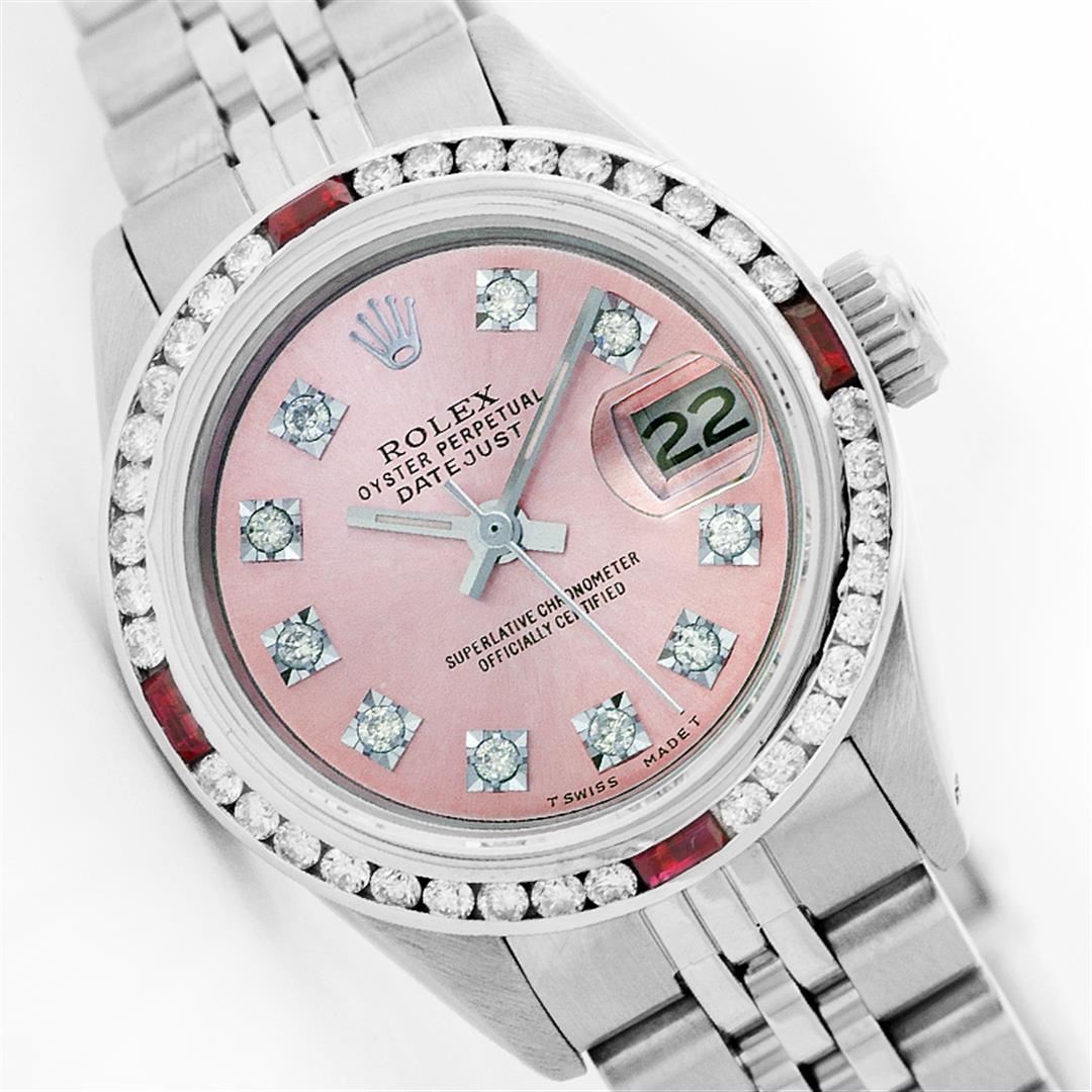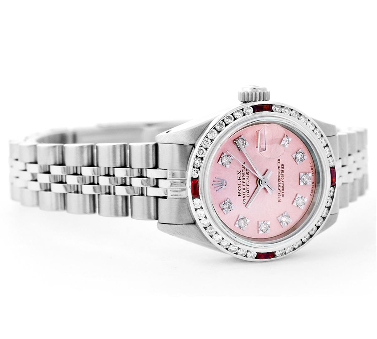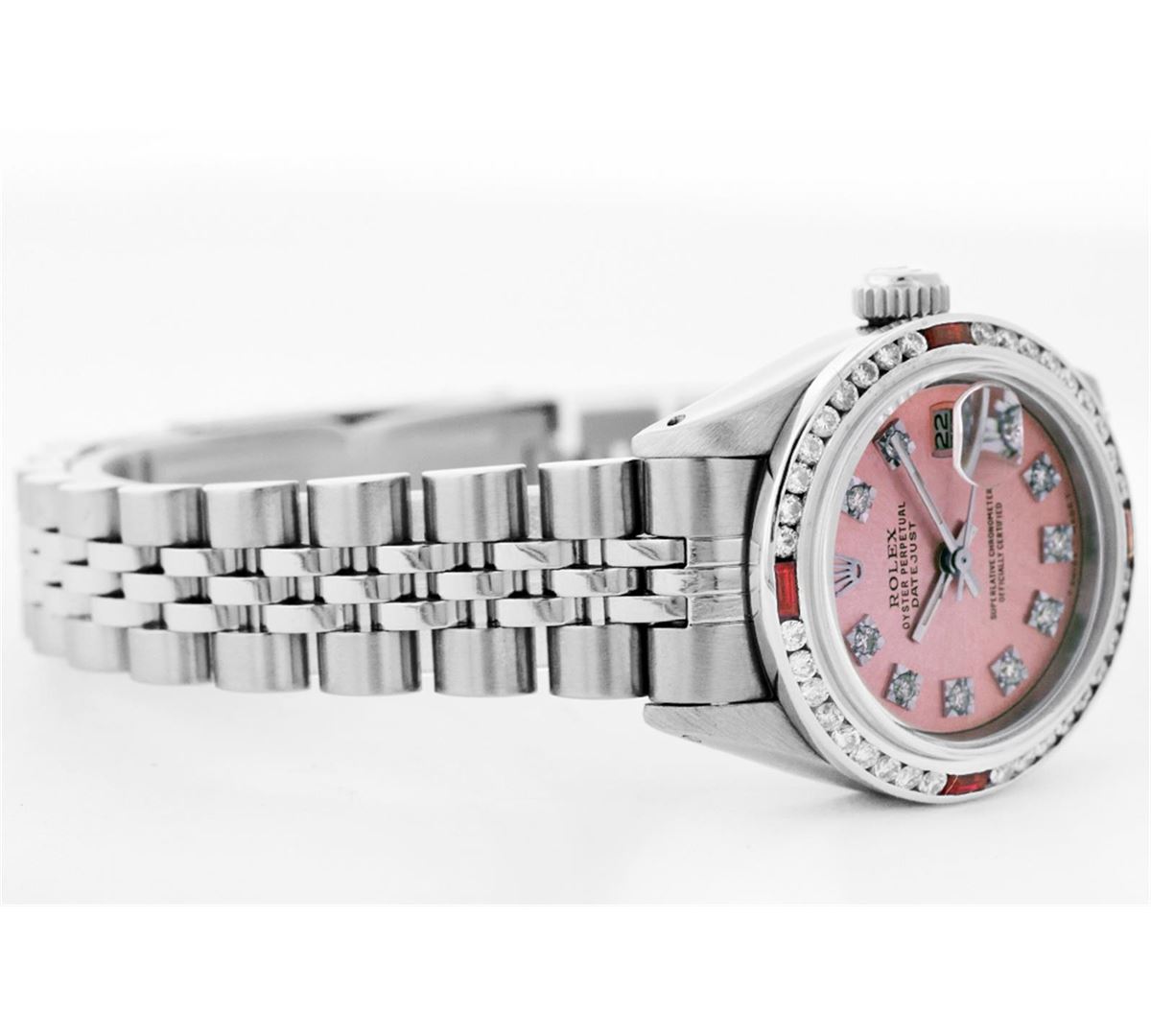 One Womens Rolex Datejust Polished Bright with Satin Finish, Serviced & Electronically Tested, Stainless Steel Case:26mm, Stainless Steel Crown, Custom Bezel: 18K White Gold Ruby Channel Set Diamond Bezel, Diamond + Gem Count: 36 Diamonds + 4 Rubies Total Weight 1.00 Carat, Clarity: SI-VS, Color: G to H. Custom Crystal: Synthetic Sapphire Cyclops Lens. Movement: Automatic Winding Movement Caliber 2135. Custom Dial: Ice Pink Diamond Dial, Diamond Count: 10 Diamonds, Clarity: SI-VS, Color:G to H. Date Window: 3 O'Clock Position Date Display, Quickset, Model: Datejust, Condition: G-6 Extra Fine. Bracelet:Stainless Steel Jubilee. Bright Polish & Satin Finish. 5.5 Inch Length, Adjustable. Standard Clasp, With Rolex Logo.