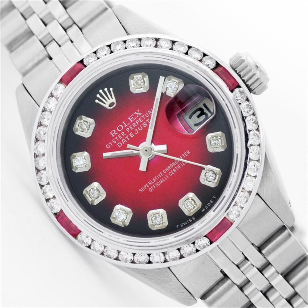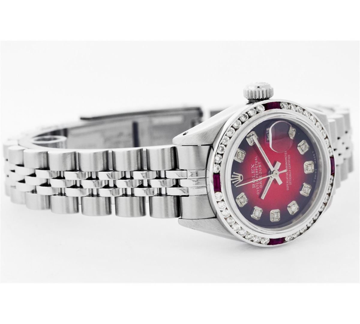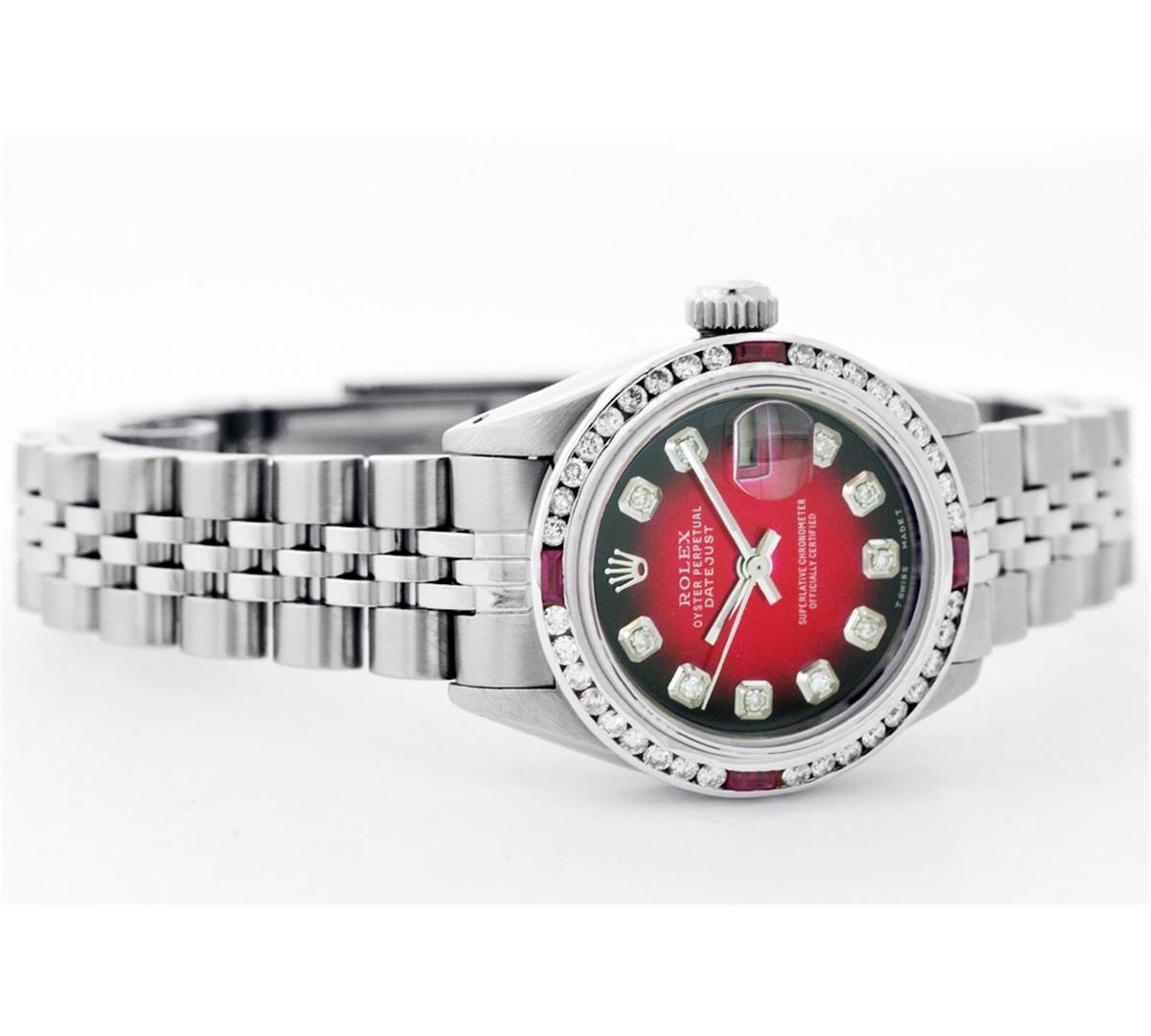 One Womens Rolex Datejust Polished Bright with Satin Finish, Serviced & Electronically Tested, Stainless Steel Case:26mm, Stainless Steel Crown, Custom Bezel: 18K White Gold Ruby Channel Set Diamond Bezel, Diamond + Gem Count: 36 Diamonds + 4 Rubies Total Weight 1.00 Carat, Clarity: SI-VS, Color: G to H. Custom Crystal: Synthetic Sapphire Cyclops Lens. Movement: Automatic Winding Movement Caliber 2135. Custom Dial: Red Vignette With Diamond Hour Markers, Diamond Count: 10 Diamonds, Clarity: SI-VS, Color:G to H. Date Window: 3 O'Clock Position Date Display, Quickset, Model: Datejust, Condition: G-6 Extra Fine. Bracelet:Stainless Steel Jubilee. Bright Polish & Satin Finish. 5.5 Inch Length, Adjustable. Standard Clasp, With Rolex Logo.