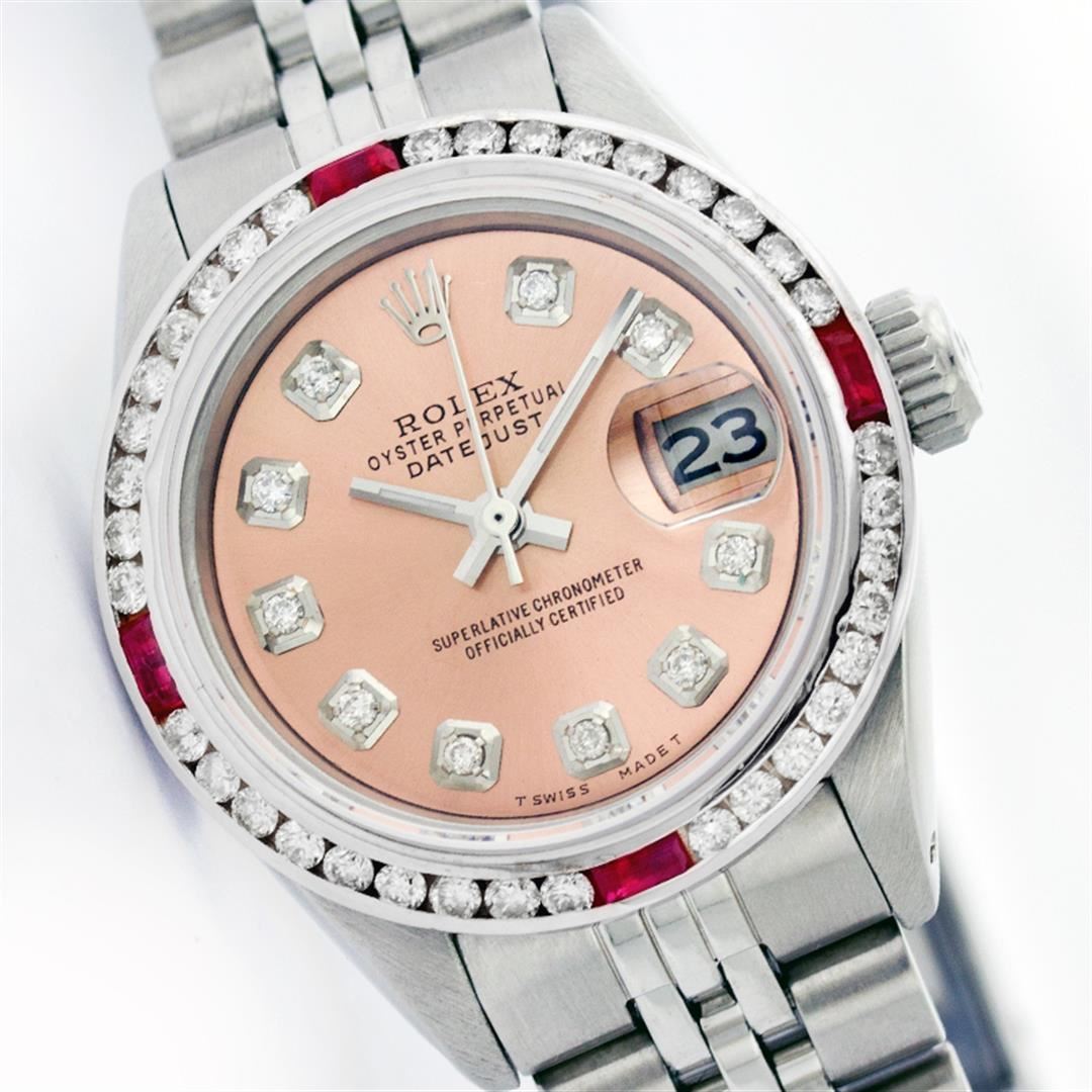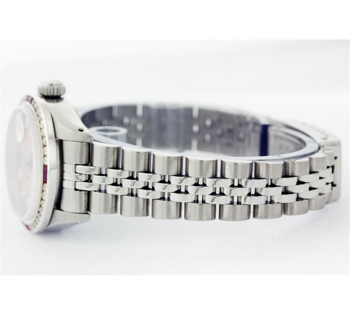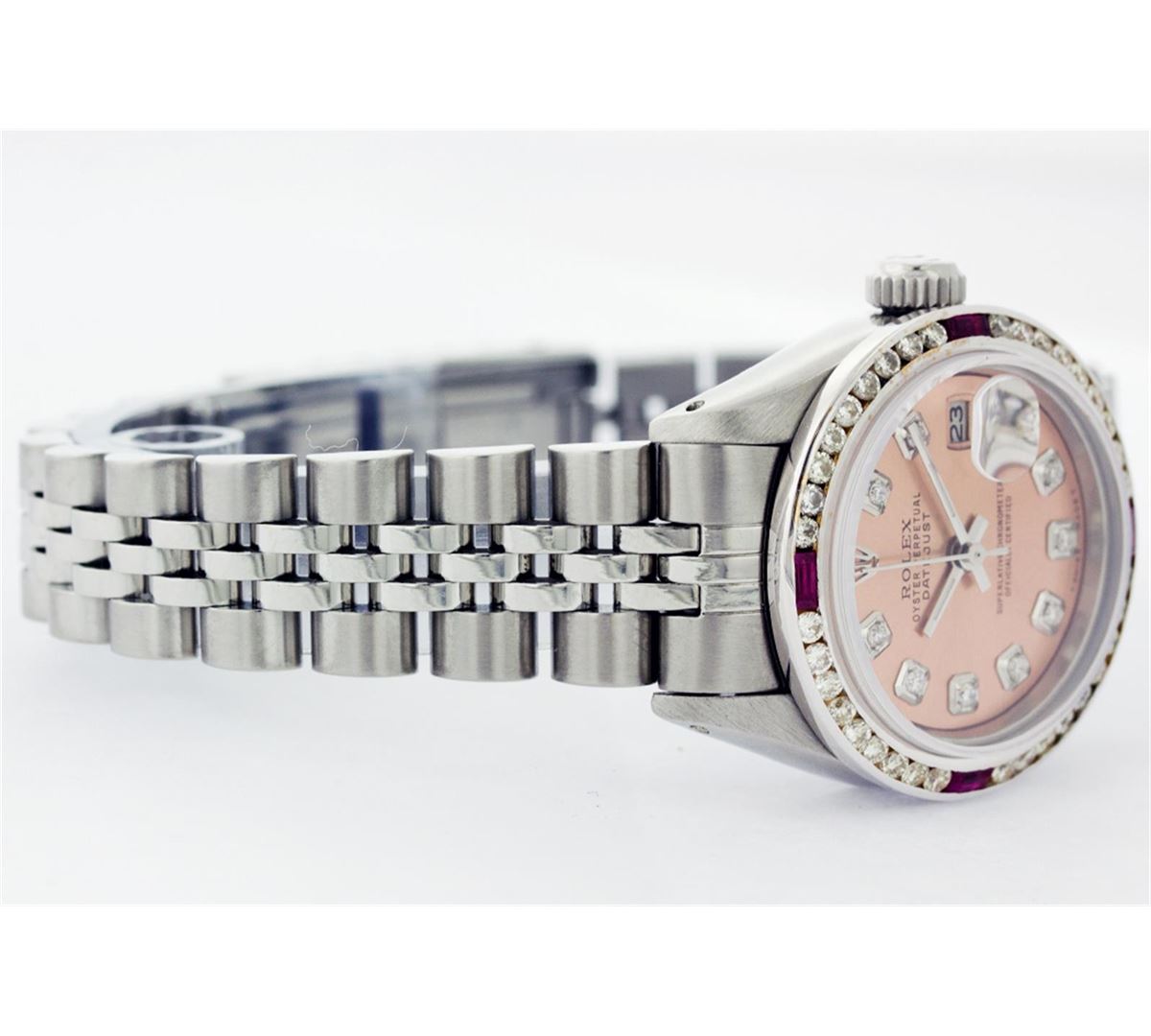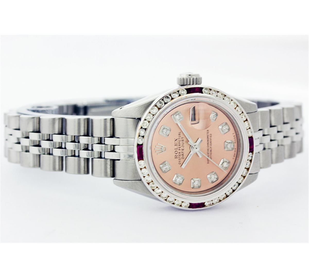 One Womens Rolex Datejust Polished Bright with Satin Finish, Serviced & Electronically Tested, Stainless Steel Case:26mm, Stainless Steel Crown, Custom Bezel: 18K White Gold Ruby Channel Set Diamond Bezel, Diamond + Gem Count: 36 Diamonds + 4 Rubies Total Weight 1.00 Carat, Clarity: SI-VS, Color: G to H. Custom Crystal: Synthetic Sapphire Cyclops Lens. Movement: Automatic Winding Movement Caliber 2135. Custom Dial: Salmon Diamond Dial, Diamond Count: 10 Diamonds, Clarity: SI-VS, Color:G to H. Date Window: 3 O'Clock Position Date Display, Quickset, Model: Datejust, Condition: G-6 Extra Fine. Bracelet:Stainless Steel Jubilee. Bright Polish & Satin Finish. 5.5 Inch Length, Adjustable. Standard Clasp, With Rolex Logo.