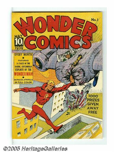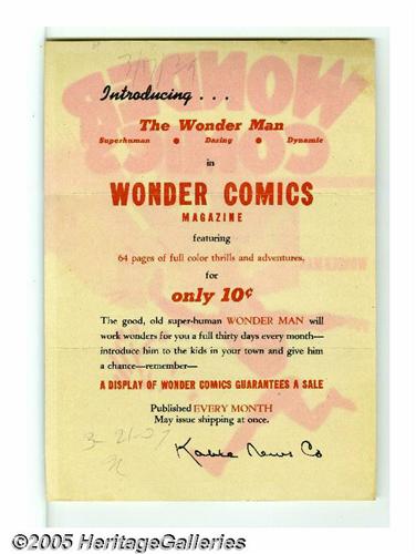 <B>Wonder Comics #1 Promotional Cover Announcement (Fox Features Syndicate, 1939).</B></I> Before <B>Wonder Comics</B></I> #1 hit the newsstands, comic and magazine distributors received this rare promotional flier touting the new character, who would later be the subject of a ground-breaking legal decision when DC Comics sued to protect their Superman trademark. The front of this announcement features Will Eisner's cover art, while on the reverse is a message from Kable News Co. that reads "Introducing... The Wonder Man, Superhuman - Daring - Dynamic in Wonder Comics Magazine...." They add "The good, old super-human Wonder Man will work wonders for you a full thirty days every month -- introduce him to the kids in your town and give him a chance -- remember -- A Display Of Wonder Comics Guarantees A Sale." The back also has two arrival dates written in pencil, at the top is the date "3/17/39" and near the bottom is the date "3-21-39". Like the other announcements offered in this auction, this one has two horizontal folds to facilitate mailing in a standard business envelope. Other than a half-inch tear at the right edge of the upper crease, the condition is Excellent.