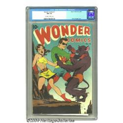Wonder Comics #11 (Better Publications, 1947) CGC NM 9.4 Off-white to white pages. The formidable covers on many of Better/Standard/Nedors have kept collectors fascinated for decades. Most fans think of Alex Schomburg's work, of course, but feast your eyes on this campy masterpiece from Graham Ingels. Who's that costumed dude with the luscious babe anyway? You won't find a higher graded copy on CGC's most recent census. Overstreet 2003 NM 9.4 value = $675. Important notice: Heritage usually auctions material at the rate of 200-250 lots per hour. On some occasions eBay Live bid software or the Internet may not be able to keep up with the pace of the auction. We recommend placing a realistic absentee bid now as insurance to avoid disappointment. Occasionally the auctioneer may eliminate or reject an eBay Live bid, and the auctioneer may also reopen a lot after the close of the eBay live bidding (usually because we missed an audience bid), and may reject your bid even if it shows you as the winning bidder. By bidding via eBay Live, you agree that Heritage may award the lot to another bidder at its sole discretion under the circumstances described above or any other reasonable circumstances. Since eBay bids are not shown to us until we open the lot on the floor, we treat those bids just like floor bids. In most cases the floor responds before the eBay bid is presented to us, due to Internet lag time, so for consistency we have made it a policy that floor bids are always considered first over tie eBay live bids. Also please note that all Heritage lots purchased through eBay Live carry a 20% Buyer's Premium. Please make sure you read the Terms and Conditions before you bid.