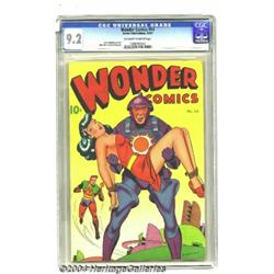 Wonder Comics #14 (Better Publications, 1947) CGC NM- 9.2 Off-white to white pages. Alex Schomburg's airbrush covers for Better/Nedor are awe-inspiring a half-century later; imagine the impact they had on comic readers in the late 1940s. This bondage cover certainly has plenty of timeless appeal! 1947 was the year of "good girl" art, and Schomburg proves with this sexy cover that his girls were as "good" as any, and deserving of the beautiful copy offered here. Overstreet 2003 NM 9.4 value = $675. Important notice: Heritage usually auctions material at the rate of 200-250 lots per hour. On some occasions eBay Live bid software or the Internet may not be able to keep up with the pace of the auction. We recommend placing a realistic absentee bid now as insurance to avoid disappointment. Occasionally the auctioneer may eliminate or reject an eBay Live bid, and the auctioneer may also reopen a lot after the close of the eBay live bidding (usually because we missed an audience bid), and may reject your bid even if it shows you as the winning bidder. By bidding via eBay Live, you agree that Heritage may award the lot to another bidder at its sole discretion under the circumstances described above or any other reasonable circumstances. Since eBay bids are not shown to us until we open the lot on the floor, we treat those bids just like floor bids. In most cases the floor responds before the eBay bid is presented to us, due to Internet lag time, so for consistency we have made it a policy that floor bids are always considered first over tie eBay live bids. Also please note that all Heritage lots purchased through eBay Live carry a 20% Buyer's Premium. Please make sure you read the Terms and Conditions before you bid.