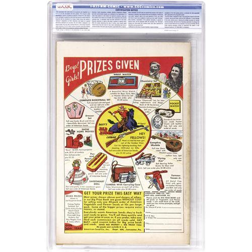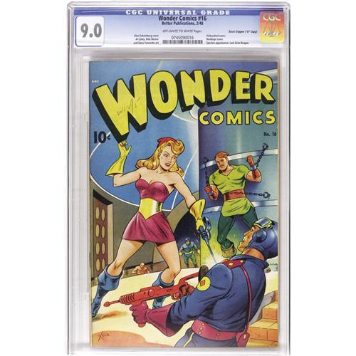<B>Wonder Comics #16 Davis Crippen ("D" Copy) pedigree (Better Publications, 1948) CGC VF/NM 9.0 Off-white to white pages.</B></I> Alex Schomburg's airbrushed cover features Tara, making her first cover appearance. Note that a small plastic stabilizing peg is loose inside the CGC holder, not affecting the comic itself or the integrity of the holder. Overstreet 2006 VF/NM 9.0 value = $593; NM- 9.2 value = $810. CGC census 7/06: 2 in 9.0, 4 higher. <I>From the Crippen Collection.</B></I> <BR><BR><B>Important notice:</B> Heritage usually auctions material at the rate of 200-250 lots per hour. On some occasions eBay Live bid software or the Internet may not be able to keep up with the pace of the auction. We recommend placing a realistic absentee bid now as insurance to avoid disappointment. Occasionally the auctioneer may eliminate or reject an eBay Live bid, and the auctioneer may also reopen a lot after the close of the eBay live bidding (usually because we missed an audience bid), and may reject your bid even if it shows you as the winning bidder. By bidding via eBay Live, you agree that Heritage may award the lot to another bidder at its sole discretion under the circumstances described above or any other reasonable circumstances. Since eBay bids are not shown to us until we open the lot on the floor, we treat those bids just like floor bids. In most cases the floor responds before the eBay bid is presented to us, due to Internet lag time, so for consistency we have made it a policy that floor bids are always considered first over tie eBay live bids. Also please note that all Heritage lots purchased through eBay Live carry a 22.5% Buyer's Premium. Please make sure you read the Terms and Conditions before you bid. This lot is being auctioned in conjunction with a live floor auction by Heritage Auction Galleries. All final auction and invoice information will be supplied by Heritage Auction Galleries, and all other information should be considered preliminary. Lot:41001 <BR><BR><B>Winning Notification and Billing:</B> After the FINAL session in this auction is complete, Heritage will send e-mail and snail mail invoices. This process normally takes several days. All final auction and invoice information will be supplied by Heritage Auction Galleries, and all other information should be considered preliminary. <BR><BR>This auction will be conducted on a live auction floor and over the Internet through eBay Live. If you choose to place an absentee bid, please take a moment to <font color='#0000ff'><u><a href='http://pages.ebay.com/liveauctions/help/before/laabsentee.html'>learn how eBay Live absentee bidding works</a></u></font><font color='#000000'>