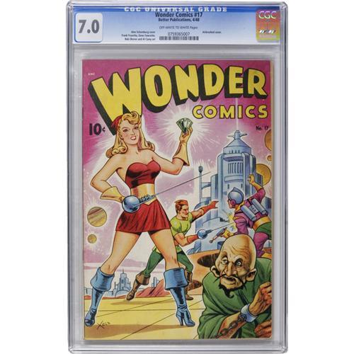<B>Wonder Comics #17 (Better Publications, 1948) CGC FN/VF 7.0 Off-white to white pages.</B></I> Besides the spectacular Alex Schomburg airbrushed cover, the great Frank Frazetta contributed panels for this issue. Other artists included Gene Fawcette, Bob Oksner, and Al Camy. Overstreet 2006 FN 6.0 value = $186; VF 8.0 value = $388. CGC census 3/07: 3 in 7.0, 7 higher. <I> From the Cary and Cheryl Porter Collection.</B></I><BR><BR><b>Shipping:</b> Comics - Slabbed (certified) (<a target="_blank" href="http://www.heritageauctions.com/common/shipping.php">view shipping information</a>)
