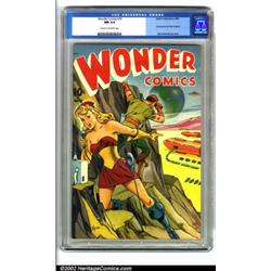 Wonder Comics #19 (Better Publications, 1948). A fantastic copy from this high demand series features a great Alex Schomburg (Xela) outer space cover, and interior art by the legendary Frank Frazetta. This book, one of the scarcer numbers in the run, is virtually flawless and has good color. CGC NM 9.4 Cream to off-white pages. Overstreet 2001 NM 9.4 value = $540.  Important notice: We expect to be auctioning lots at the rate of 200-250 per hour. Sometimes eBay Premier live bid software cannot keep up with that pace, so we strongly recommend that you place a realistic proxy bid now as insurance to avoid disappointment. Also please note that all Heritage/CAA lots purchased through eBay Premier carry a 20% Buyer's Premium.