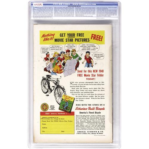 48C. COMICS – Comic books sold referencing a third-party grading service are sold "as is" without any express or implied warranty. Certain warranties may be available from the grading services and the Bidder is referred to them for further details: Comics Guaranty Corporation (CGC), P.O. Box 4738, Sarasota, FL 34230. Subject to sections 57 and 58, bidders who intend to challenge authenticity or provenance of a lot must notify Auctioneer in writing within thirty (30) days of the Auction's conclusion. Auctioneer's maximum liability shall not exceed the high bid on that lot, which bid shall be deemed for all purposes the value of the lot. In the event Auctioneer cannot deliver the lot or subsequently it is established that the lot lacks title, provenance, authenticity, or other transfer or condition issue is claimed, Auctioneer's liability shall be limited to recission of sale and refund of purchase price. After one year has elapsed, Auctioneer's maximum liability shall be limited to any commissions and fees Auctioneer earned on that lot.