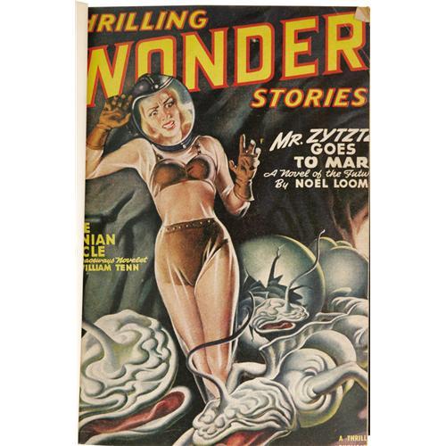 <B>Wonder Stories (Pulp) Bound Volumes Group (Standard, 1929-50).</B></I> The series represented here includes the titles <B>Wonder Science Stories</B></I>, <B>Wonder Stories</B></I>, and <B>Thrilling Wonder Stories</B></I>. Included in this lot are 23 hardcover volumes containing a nearly complete run spanning from June 1929 through December 1950. The only missing issue we can see is the June 1936 edition. Wonderful Frank Paul cover art. Authors include L. Ron Hubbard and Ray Bradbury. All volumes have supple pages. These pulps had their back cover removed prior to binding. Bookery's Guide to Pulps approximate VG value for group = $3,600. <BR><BR><B>Important notice:</B> Heritage usually auctions material at the rate of 200-250 lots per hour. On some occasions eBay Live bid software or the Internet may not be able to keep up with the pace of the auction. We recommend placing a realistic absentee bid now as insurance to avoid disappointment. Occasionally the auctioneer may eliminate or reject an eBay Live bid, and the auctioneer may also reopen a lot after the close of the eBay live bidding (usually because we missed an audience bid), and may reject your bid even if it shows you as the winning bidder. By bidding via eBay Live, you agree that Heritage may award the lot to another bidder at its sole discretion under the circumstances described above or any other reasonable circumstances. Since eBay bids are not shown to us until we open the lot on the floor, we treat those bids just like floor bids. In most cases the floor responds before the eBay bid is presented to us, due to Internet lag time, so for consistency we have made it a policy that floor bids are always considered first over tie eBay live bids. Also please note that all Heritage lots purchased through eBay Live carry a 22.5% Buyer's Premium. Please make sure you read the Terms and Conditions before you bid. This lot is being auctioned in conjunction with a live floor auction by Heritage Auction Galleries. All final auction and invoice information will be supplied by Heritage Auction Galleries, and all other information should be considered preliminary. Lot:41001 <BR><BR><B>Winning Notification and Billing:</B> After the FINAL session in this auction is complete, Heritage will send e-mail and snail mail invoices. This process normally takes several days. All final auction and invoice information will be supplied by Heritage Auction Galleries, and all other information should be considered preliminary. <BR><BR>This auction will be conducted on a live auction floor and over the Internet through eBay Live. If you choose to place an absentee bid, please take a moment to <font color='#0000ff'><u><a href='http://pages.ebay.com/liveauctions/help/before/laabsentee.html'>learn how eBay Live absentee bidding works</a></u></font><font color='#000000'>