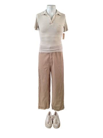Mickey (Justin Timberlake) screen worn, hero, vintage, striped cream and blue short sleeve polo shirt, khaki 50's style pants with wide leg custom made for the film by "Bill Hargate Costumes". Inside Bill Hargate tag reads "Justin Timberlake" written in pen. Also includes white, production soiled, "Converse" tennis shoes (10). Worn in the scene on the pier with Ginny (Kate Winslet). Wardrobe tag included. A portion of the proceeds will be split equally from this sale to benefit The Entertainment Industry Foundation &
