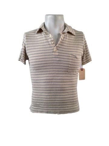 Mickey (Justin Timberlake) screen worn, hero, cream colored short sleeve polo shirt with light blue pin stripes. Wardrobe tag included.