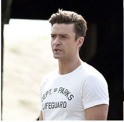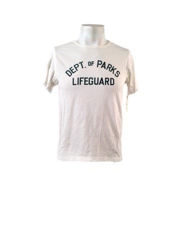 Mickey (Justin Timberlake) screen worn, hero, cream colored, " Dept of Parks Lifeguard" short sleeve t-shirt with green font. Wardrobe tag included.