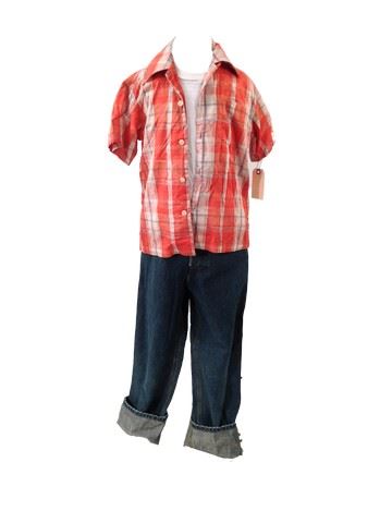 Richie (Jack Gore) screen worn, button down, orange, cream and blue, short sleeve plaid shirt, off white t-shirt,  and wide leg dark wash "Barack" jeans. Wardrobe tag included.