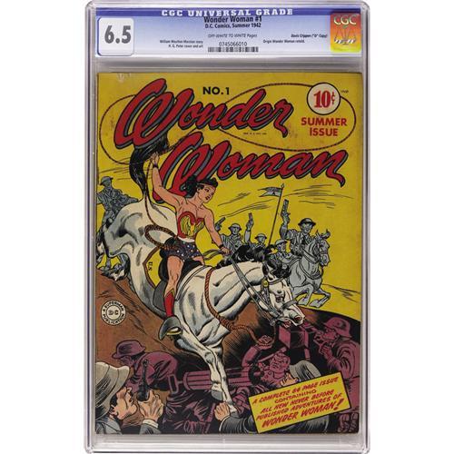 <B>Wonder Woman #1 Davis Crippen ("D" Copy) pedigree (DC, 1942) CGC FN+ 6.5 Off-white to white pages.</B></I> Ranked among the 30 most valuable comics by Overstreet, this first issue of Wonder Woman's own title came out just half a year or so after her debut in <B>All Star Comics</B></I> #8 (she had appeared in <B>Sensation Comics</B></I> in the meantime). And this new series would last for four decades. Wonder Woman has been called "the only mythological character to flourish in the comics format," and we can't think of another to do so until Thor appeared some two decades later. Wonder Woman's early adventures, written by William Moulton Marston and drawn by H. G. Peter, still fascinate today. As you might expect from a #1 issue, the heroine's origin story is retold and expanded upon here. Overstreet 2006 FN 6.0 value = $6,834; VF 8.0 value = $17,000. CGC census 6/06: 1 in 6.5, 12 higher. <I>From the Crippen Collection.</B></I> <BR><BR><B>Important notice:</B> Heritage usually auctions material at the rate of 200-250 lots per hour. On some occasions eBay Live bid software or the Internet may not be able to keep up with the pace of the auction. We recommend placing a realistic absentee bid now as insurance to avoid disappointment. Occasionally the auctioneer may eliminate or reject an eBay Live bid, and the auctioneer may also reopen a lot after the close of the eBay live bidding (usually because we missed an audience bid), and may reject your bid even if it shows you as the winning bidder. By bidding via eBay Live, you agree that Heritage may award the lot to another bidder at its sole discretion under the circumstances described above or any other reasonable circumstances. Since eBay bids are not shown to us until we open the lot on the floor, we treat those bids just like floor bids. In most cases the floor responds before the eBay bid is presented to us, due to Internet lag time, so for consistency we have made it a policy that floor bids are always considered first over tie eBay live bids. Also please note that all Heritage lots purchased through eBay Live carry a 22.5% Buyer's Premium. Please make sure you read the Terms and Conditions before you bid. This lot is being auctioned in conjunction with a live floor auction by Heritage Auction Galleries. All final auction and invoice information will be supplied by Heritage Auction Galleries, and all other information should be considered preliminary. Lot:41001 <BR><BR><B>Winning Notification and Billing:</B> After the FINAL session in this auction is complete, Heritage will send e-mail and snail mail invoices. This process normally takes several days. All final auction and invoice information will be supplied by Heritage Auction Galleries, and all other information should be considered preliminary. <BR><BR>This auction will be conducted on a live auction floor and over the Internet through eBay Live. If you choose to place an absentee bid, please take a moment to <font color='#0000ff'><u><a href='http://pages.ebay.com/liveauctions/help/before/laabsentee.html'>learn how eBay Live absentee bidding works</a></u></font><font color='#000000'>