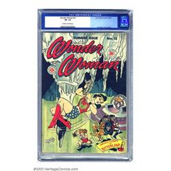 Wonder Woman #13 (DC, 1945) CGC VF- 7.5 Off-white to white pages. A truly beautiful H. G. Peter cover highlights this early issue of WW. This is a stunning high-grade copy with sharp corners and exceptional color--a very fresh-looking book. A perfect find for the devoted Wonder Woman collector. Overstreet 2002 VF 8.0 value = $625. Important notice: We expect to be auctioning lots at the rate of 200-250 per hour. Sometimes eBay Premier live bid software cannot keep up with that pace, so we strongly recommend that you place a realistic proxy bid now as insurance to avoid disappointment. Also please note that all Heritage/CAA lots purchased through eBay Premier carry a 20% Buyer's Premium. Please make sure you read the Terms and Conditions.