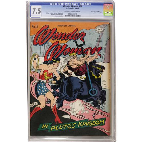 <B>Wonder Woman #16 Davis Crippen ("D" Copy) pedigree (DC, 1946) CGC VF- 7.5 Cream to off-white pages.</B></I> H. G. Peter drew this issue's cover in addition to illustrating William Moulton Marston's story. Overstreet 2006 VF 8.0 value = $706. CGC census 9/06: 1 in 7.5, 6 higher. <I>From the Crippen Collection.</B></I><BR><BR><b>Shipping:</b> Slabbed Comic (<a target="_blank" href="http://www.heritageauctions.com/common/shipping.php">view shipping information</a>)