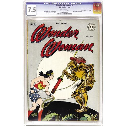 <B>Wonder Woman #18 Davis Crippen ("D" Copy) pedigree (DC, 1946) CGC VF- 7.5 Off-white pages.</B></I> Wonder Woman battles the treacherous Dr. Psycho in "The Return From the Dead" story. The cover also reminds us that a knight without a full moon is like Wonder Woman without her golden lasso. This issue has very nice page quality. Overstreet 2006 VF 8.0 value = $706. CGC census 10/06: 1 in 7.5, 5 higher. <I>From the Crippen Collection.</B></I><BR><BR><b>Shipping:</b> Slabbed Comic (<a target="_blank" href="http://www.heritageauctions.com/common/shipping.php">view shipping information</a>)