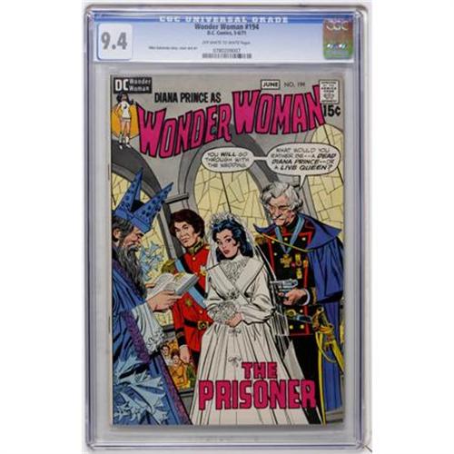 <B>Wonder Woman #194 (DC, 1971) CGC NM 9.4 Off-white to white pages.</B></I> Mike Sekowsky story, cover, and art. Overstreet 2007 NM- 9.2 value = $55. CGC census 9/07: 5 in 9.4, 2 higher. <I> From the Fantastic Frank Collection.</B></I><BR><BR><b>Shipping:</b> Comics - Slabbed (certified) (<a target="_blank" href="http://www.heritageauctions.com/common/shipping.php">view shipping information</a>)
