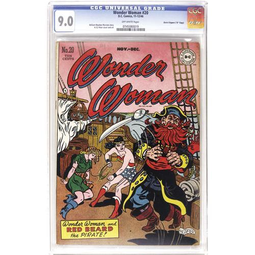 <B>Wonder Woman #20 Davis Crippen ("D" Copy) pedigree (DC, 1946) CGC VF/NM 9.0 Off-white pages.</B></I> Adventure on the high seas is the order of the day in this issue which has a swashbuckling cover by H. G. Peter who also contributes the interior art. Overstreet 2006 VF/NM 9.0 value = $1,116; NM- 9.2 value = $1,525. CGC census 7/06: 1 in 9.0, 4 higher. <I>From the Crippen Collection.</B></I> <BR><BR><B>Important notice:</B> Heritage usually auctions material at the rate of 200-250 lots per hour. On some occasions eBay Live bid software or the Internet may not be able to keep up with the pace of the auction. We recommend placing a realistic absentee bid now as insurance to avoid disappointment. Occasionally the auctioneer may eliminate or reject an eBay Live bid, and the auctioneer may also reopen a lot after the close of the eBay live bidding (usually because we missed an audience bid), and may reject your bid even if it shows you as the winning bidder. By bidding via eBay Live, you agree that Heritage may award the lot to another bidder at its sole discretion under the circumstances described above or any other reasonable circumstances. Since eBay bids are not shown to us until we open the lot on the floor, we treat those bids just like floor bids. In most cases the floor responds before the eBay bid is presented to us, due to Internet lag time, so for consistency we have made it a policy that floor bids are always considered first over tie eBay live bids. Also please note that all Heritage lots purchased through eBay Live carry a 22.5% Buyer's Premium. Please make sure you read the Terms and Conditions before you bid. This lot is being auctioned in conjunction with a live floor auction by Heritage Auction Galleries. All final auction and invoice information will be supplied by Heritage Auction Galleries, and all other information should be considered preliminary. Lot:41001 <BR><BR><B>Winning Notification and Billing:</B> After the FINAL session in this auction is complete, Heritage will send e-mail and snail mail invoices. This process normally takes several days. All final auction and invoice information will be supplied by Heritage Auction Galleries, and all other information should be considered preliminary. <BR><BR>This auction will be conducted on a live auction floor and over the Internet through eBay Live. If you choose to place an absentee bid, please take a moment to <font color='#0000ff'><u><a href='http://pages.ebay.com/liveauctions/help/before/laabsentee.html'>learn how eBay Live absentee bidding works</a></u></font><font color='#000000'>