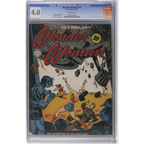 <B>Wonder Woman #4 (DC, 1943) CGC VG 4.0 Off-white pages.</B></I> Note that only two copies of this issue have been graded higher than our VG offering to date! In the issue, Wonder Woman meets some Mole Men who want to take over the surface world (there's nothing new under the sun, eh <B>Fantastic Four</B></I> #1 fans?). H. G. Peter handled the cover and interior art. Overstreet 2006 VG 4.0 value = $364. CGC census 3/06: 3 in 4.0, 2 higher. <I>From the Collection of Harold Curtis.</B></I>