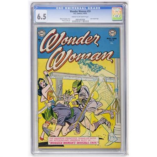 <B>Wonder Woman #59 (DC, 1953) CGC FN+ 6.5 Cream to off-white pages.</B></I> Last issue with the original logo. Irv Novick cover. H. G. Peter art. Overstreet 2007 FN 6.0 value = $123; VF 8.0 value = $250. CGC census 1/08: 1 in 6.5, 5 higher. <I> From the Toronto Collection.</B></I><BR><BR><b>Shipping:</b> Comics - Slabbed (certified) (<a target="_blank" href="http://www.heritageauctions.com/common/shipping.php">view shipping information</a>)