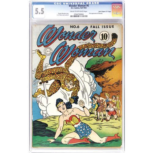 <B>Wonder Woman #6 Davis Crippen ("D" Copy) pedigree (DC, 1943) CGC FN- 5.5 Cream to off-white pages.</B></I> The Cheetah made her first appearance here, and you could make a case for her as the #1 Wonder Woman villain! She certainly played that role in the "Super Friends" cartoons, and an incarnation of the character is appearing in comics even today. H. G. Peter provided the cover and interior art for this issue. Overstreet 2006 FN 6.0 value = $423. CGC census 6/06: 1 in 5.5, 5 higher. <I>From the Crippen Collection.</B></I> <BR><BR><B>Important notice:</B> Heritage usually auctions material at the rate of 200-250 lots per hour. On some occasions eBay Live bid software or the Internet may not be able to keep up with the pace of the auction. We recommend placing a realistic absentee bid now as insurance to avoid disappointment. Occasionally the auctioneer may eliminate or reject an eBay Live bid, and the auctioneer may also reopen a lot after the close of the eBay live bidding (usually because we missed an audience bid), and may reject your bid even if it shows you as the winning bidder. By bidding via eBay Live, you agree that Heritage may award the lot to another bidder at its sole discretion under the circumstances described above or any other reasonable circumstances. Since eBay bids are not shown to us until we open the lot on the floor, we treat those bids just like floor bids. In most cases the floor responds before the eBay bid is presented to us, due to Internet lag time, so for consistency we have made it a policy that floor bids are always considered first over tie eBay live bids. Also please note that all Heritage lots purchased through eBay Live carry a 22.5% Buyer's Premium. Please make sure you read the Terms and Conditions before you bid. This lot is being auctioned in conjunction with a live floor auction by Heritage Auction Galleries. All final auction and invoice information will be supplied by Heritage Auction Galleries, and all other information should be considered preliminary. Lot:41001 <BR><BR><B>Winning Notification and Billing:</B> After the FINAL session in this auction is complete, Heritage will send e-mail and snail mail invoices. This process normally takes several days. All final auction and invoice information will be supplied by Heritage Auction Galleries, and all other information should be considered preliminary. <BR><BR>This auction will be conducted on a live auction floor and over the Internet through eBay Live. If you choose to place an absentee bid, please take a moment to <font color='#0000ff'><u><a href='http://pages.ebay.com/liveauctions/help/before/laabsentee.html'>learn how eBay Live absentee bidding works</a></u></font><font color='#000000'>