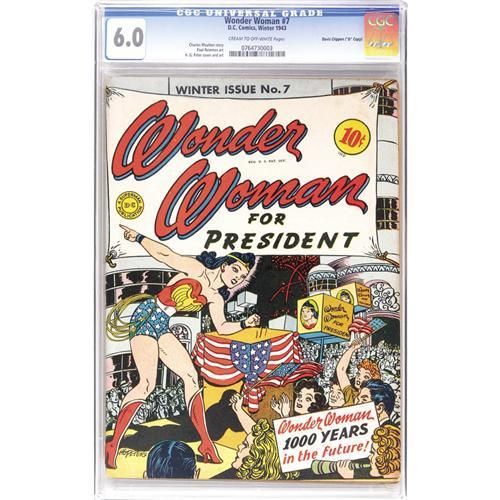 <B>Wonder Woman #7 Davis Crippen ("D" Copy) pedigree (DC, 1943) CGC FN 6.0 Cream to off-white pages.</B></I> This is one of the only issues of the title to be rated "uncommon" by Gerber. Wonder Woman's creator William Moulton Marston was a card-carrying feminist, and his convictions come through in this issue's cover and story. H. G. Peter handled art chores as usual. Overstreet 2006 FN 6.0 value = $423. CGC census 6/06: 1 in 6.0, 4 higher. <I>From the Crippen Collection.</B></I> <BR><BR><B>Important notice:</B> Heritage usually auctions material at the rate of 200-250 lots per hour. On some occasions eBay Live bid software or the Internet may not be able to keep up with the pace of the auction. We recommend placing a realistic absentee bid now as insurance to avoid disappointment. Occasionally the auctioneer may eliminate or reject an eBay Live bid, and the auctioneer may also reopen a lot after the close of the eBay live bidding (usually because we missed an audience bid), and may reject your bid even if it shows you as the winning bidder. By bidding via eBay Live, you agree that Heritage may award the lot to another bidder at its sole discretion under the circumstances described above or any other reasonable circumstances. Since eBay bids are not shown to us until we open the lot on the floor, we treat those bids just like floor bids. In most cases the floor responds before the eBay bid is presented to us, due to Internet lag time, so for consistency we have made it a policy that floor bids are always considered first over tie eBay live bids. Also please note that all Heritage lots purchased through eBay Live carry a 22.5% Buyer's Premium. Please make sure you read the Terms and Conditions before you bid. This lot is being auctioned in conjunction with a live floor auction by Heritage Auction Galleries. All final auction and invoice information will be supplied by Heritage Auction Galleries, and all other information should be considered preliminary. Lot:41001 <BR><BR><B>Winning Notification and Billing:</B> After the FINAL session in this auction is complete, Heritage will send e-mail and snail mail invoices. This process normally takes several days. All final auction and invoice information will be supplied by Heritage Auction Galleries, and all other information should be considered preliminary. <BR><BR>This auction will be conducted on a live auction floor and over the Internet through eBay Live. If you choose to place an absentee bid, please take a moment to <font color='#0000ff'><u><a href='http://pages.ebay.com/liveauctions/help/before/laabsentee.html'>learn how eBay Live absentee bidding works</a></u></font><font color='#000000'>