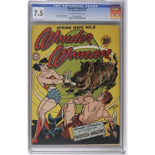 <B>Wonder Woman #8 (DC, 1944) CGC VF- 7.5 Off-white to white pages.</B></I> Wonder Woman travels to Atlantis to take on Queen Clea in this issue. William Moulton Marston (writing as Charles Moulton) provided the story, and H. G. Peter saw to the art. Overstreet 2006 VF 8.0 value = $881. CGC census 3/06: 1 in 7.5, 3 higher. <I>From the Collection of Harold Curtis.</B></I>