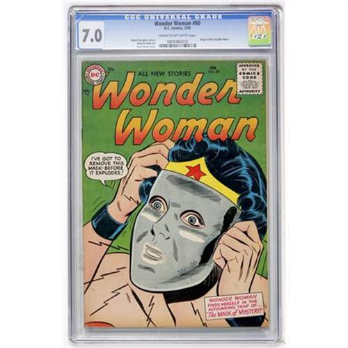 <B>Wonder Woman #80 (DC, 1956) CGC FN/VF 7.0 Cream to off-white pages.</B></I> Origin of Wonder Woman's invisible plane. Irwin Hasen cover. H. G. Peter art. Overstreet 2007 FN 6.0 value = $108; VF 8.0 value = $204. CGC census 1/08: 1 in 7.0, 1 higher. <I> From the Toronto Collection.</B></I><BR><BR><b>Shipping:</b> Comics - Slabbed (certified) (<a target="_blank" href="http://www.heritageauctions.com/common/shipping.php">view shipping information</a>)