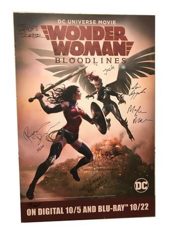Wonder Woman Bloodlines Signed Poster (on pvc thick posterboard) signed by Rosario Dawson (Wonder Woman), executive producer James Tucker, Adrienne C. Moore (Etta Candy), Courtenay Taylor (Dr. Poison) and Mairghread Scott (screenplay). Wonder Woman: Bloodlines is a 2019 American animated superhero film based on the DC Comics character Wonder Woman. It is the ninth installment in the DC Universe Animated Original Movies series and the first to feature Wonder Woman as the protagonist. The film was directed by Sam Liu and written by Mairghread Scott.