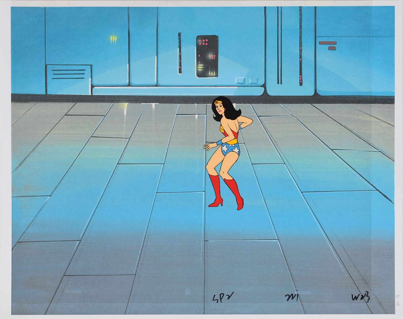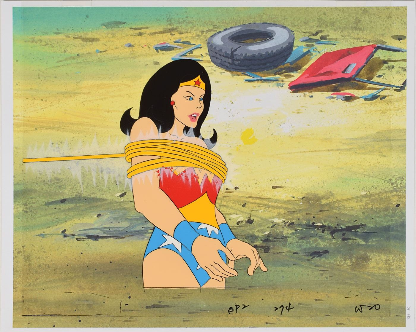 (Hanna-Barbera Studios, circa 1970s–1980s) Two original production cels featuring Wonder Woman from the Super Friends animated TV series, one showing her tied up in a lasso and the other showing her in a full-length view. The cels are placed on color copy backgrounds. Character images measures 8.25 x 7.75 and 2 x 4, with overall dimensions of 14 x 11. In overall fine condition. With Wonder Woman as popular as ever thanks to Gal Gadot's recent live-action portrayal, this is a particularly desirable pairing of vintage animation cels.