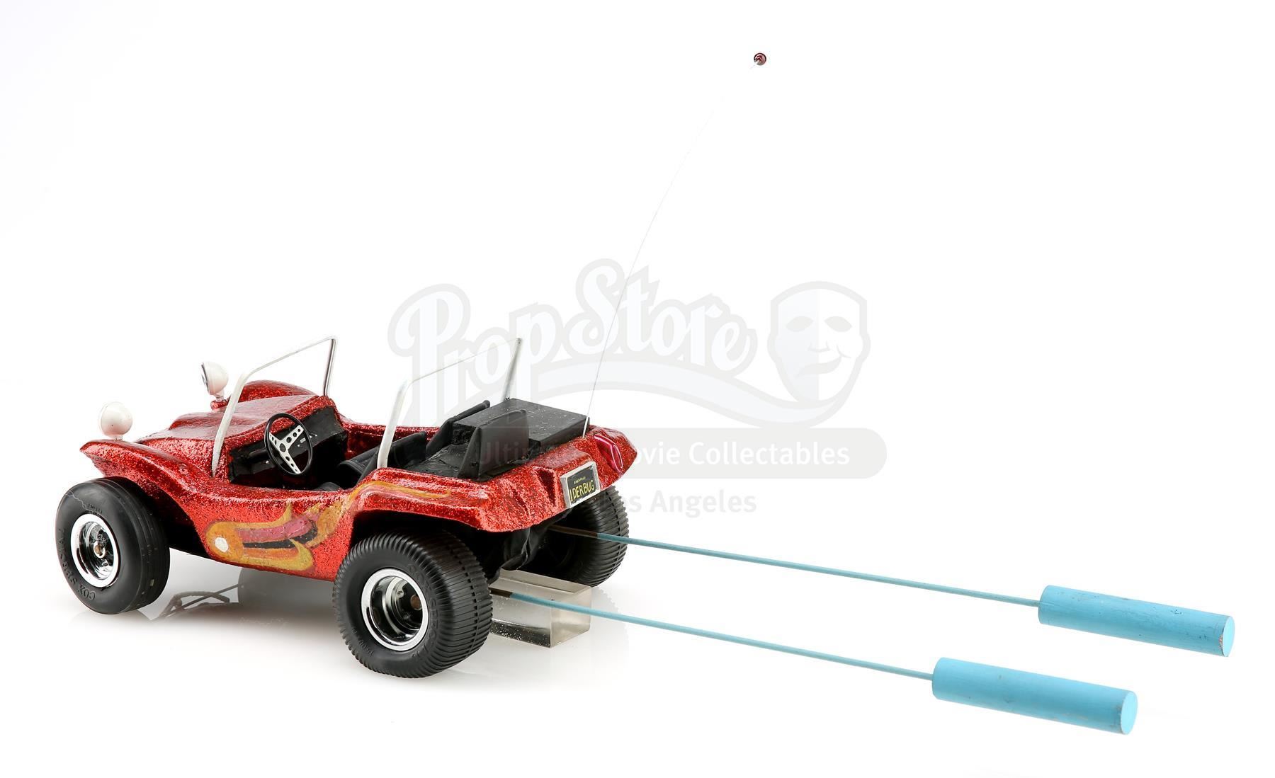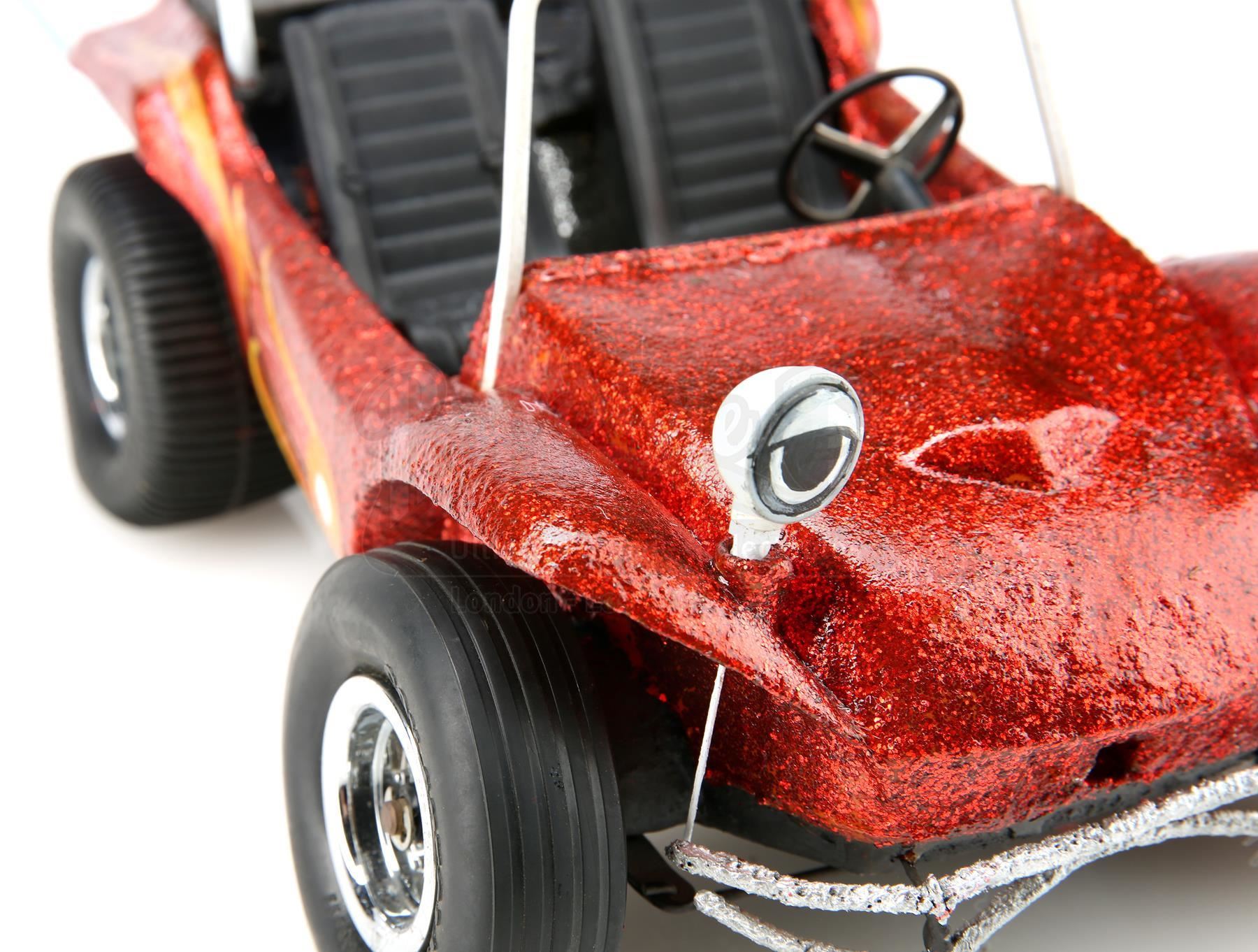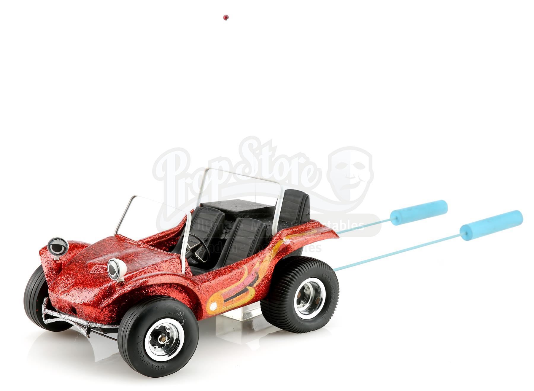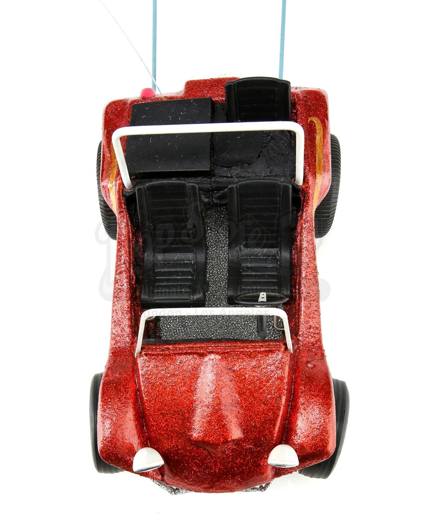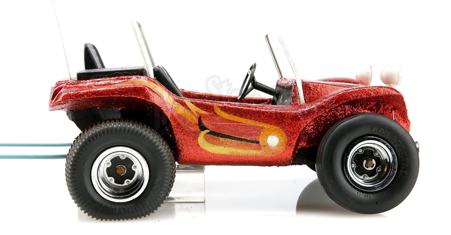 A Wonderbug red sparkling miniature dune buggy from the children’s variety show The Krofft Supershow. Wonderbug is coated in sparkling red glitter with hand-painted flames on sides on the doors, articulated eyeball headlights, and a mouth-like bumper. A custom California vanity license plate that reads ‘1DERBUG’ and a long, thin antenna are affixed to the back bumper. The interior is outfitted with plastic seats, a plastic steering wheel, dashboard details drawn in marker, and a black foam floor. Two rods with blue wood handles are affixed to the underside for the puppeteer to manipulate the car. An additional seat is included. The buggy was acquired directly from series creators Sid and Marty Krofft. Thereafter, it was stored in a light, climate and humidity-controlled fine art warehouse. As a result, while the piece is missing a tail light and exhibits some signs of production use, it remains in fine, production-used, vintage condition overall.