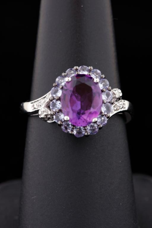 Wonderful 10K White Gold Ladies Ring set with a center oval Amethyst weighing approx 2.00 carats and surrounded by 14 round Tanzanite weighing approx 1.50 carats and side diamonds. Retail $1,250.00