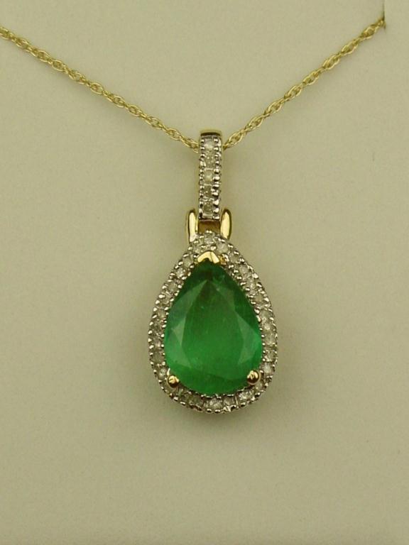 Wonderful 10K Yellow Gold Ladies Pendant Set with a center pear shape fern green Colombian emerald weighing 1.50 carats and pave set with 33 round diamonds weighing approx. 0.15 carats of H-I colors. Retail: $1,950.00Set with a center pear shape fern green Colombian emerald weighing 1.50 carats and pave set with 33 round diamonds weighing approx. 0.15 carats of H-I colors. Retail: $1,950.00
