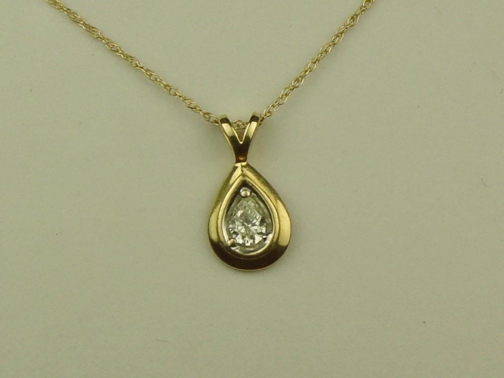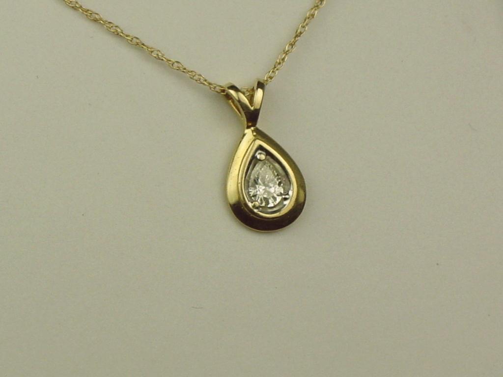 Wonderful 14K YG Ladies Custom Made Pendant Set with a center pear shape diamond weighing approx. 0.23 carats of G-H color and VS clarity. Retail: $1,650.00Set with a center pear shape diamond weighing approx. 0.23 carats of G-H color and VS clarity. Retail: $1,650.00