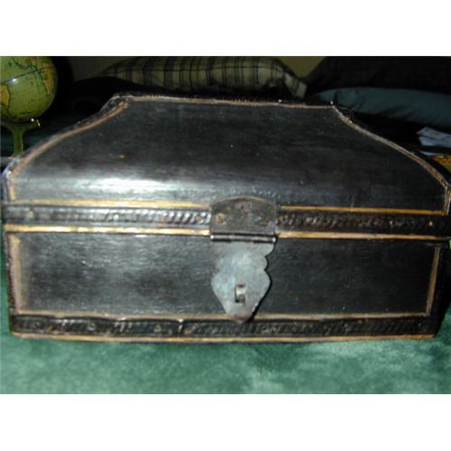 The edges of the box are all covered in a black metal that on its outer edges is shown as goldish in colour to highlight the decorative aspects of this box. The shape reminds me of asarcophacus tea caddy.