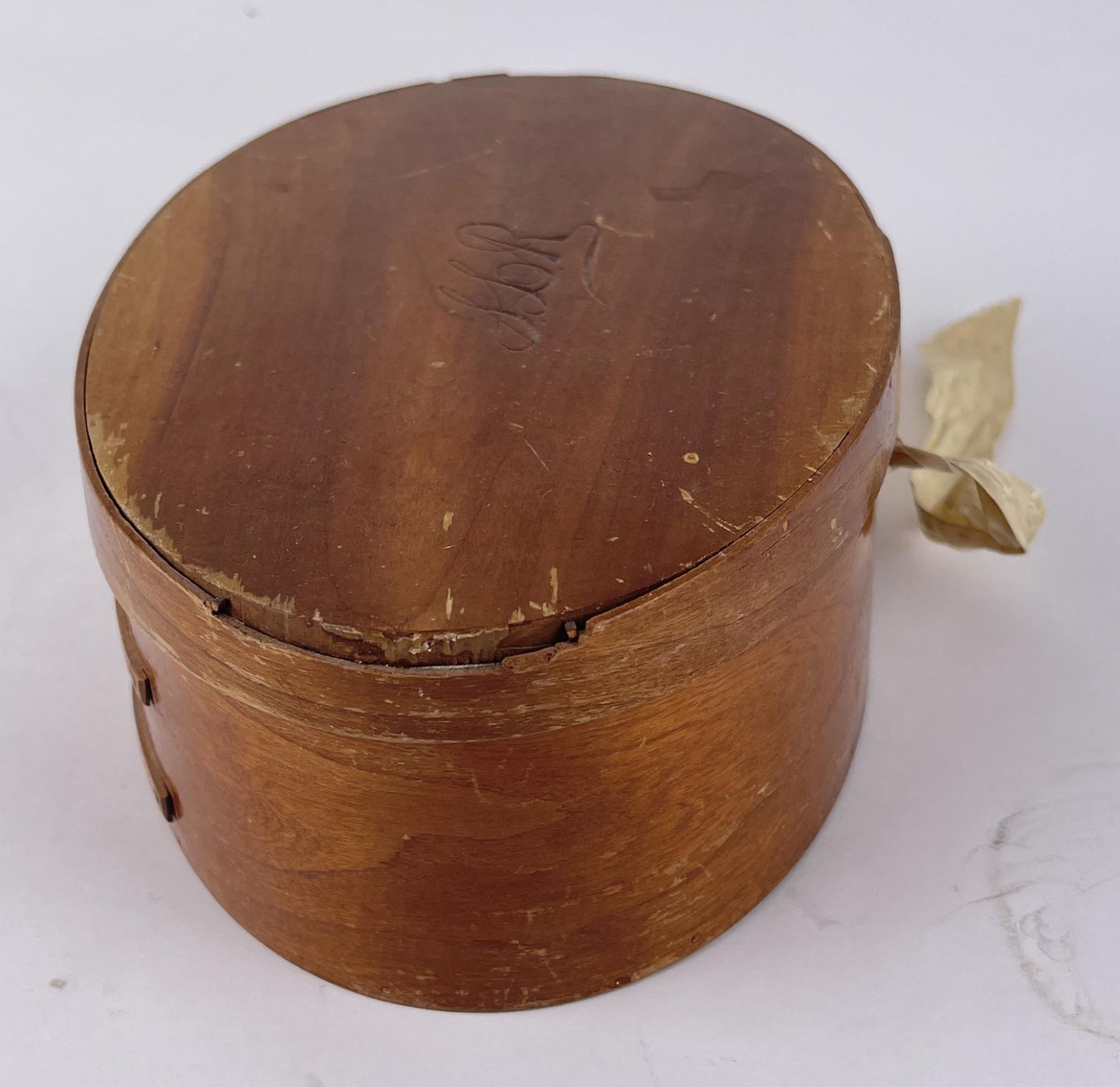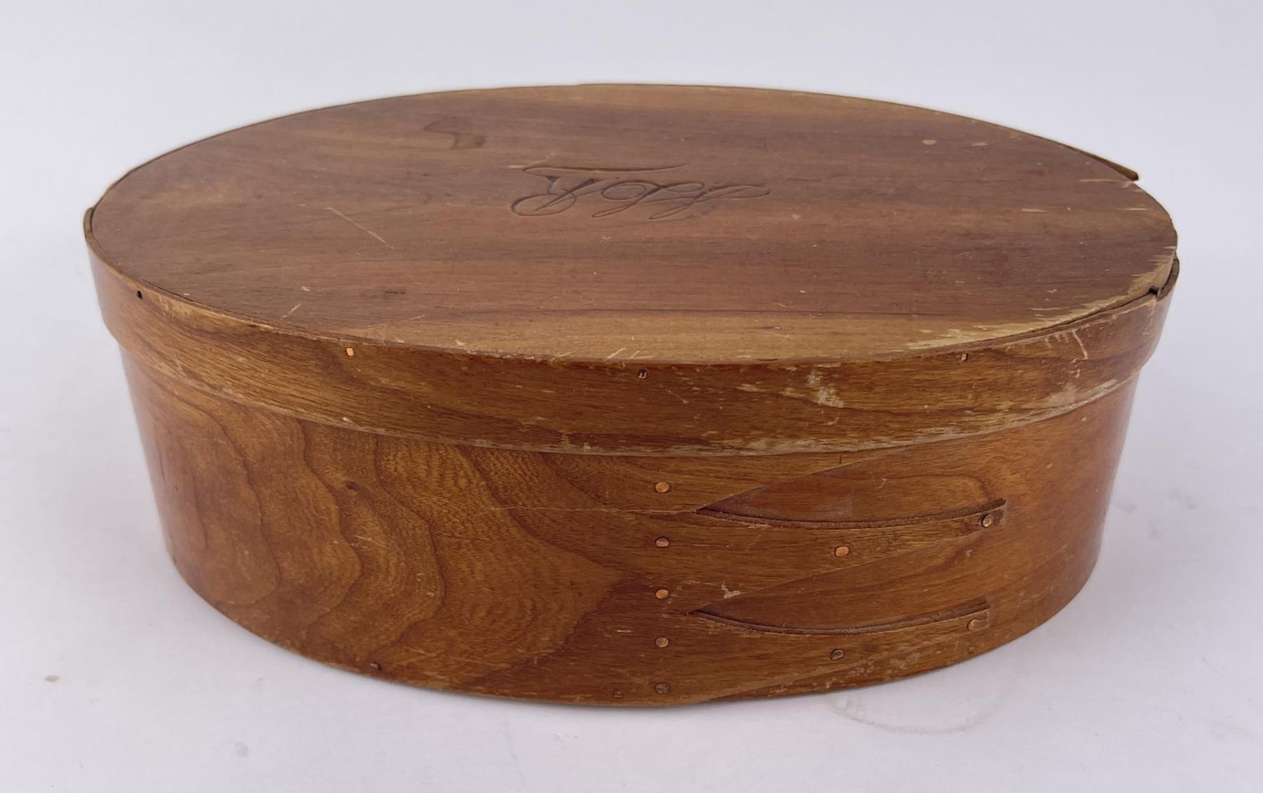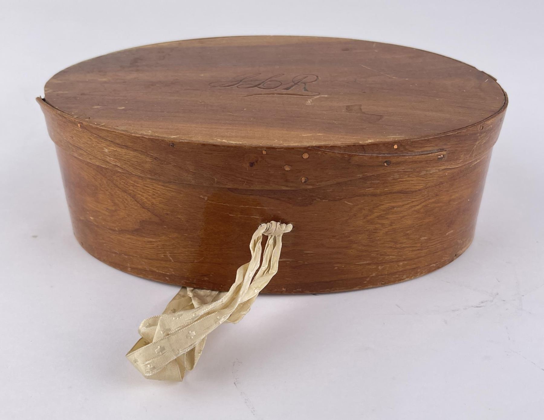 Beautiful old box. Family initials carved into the top. Still retains silk ribbon and lining. 8" long. 3" tall.