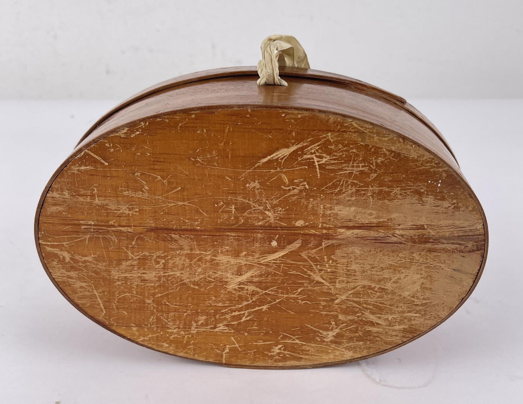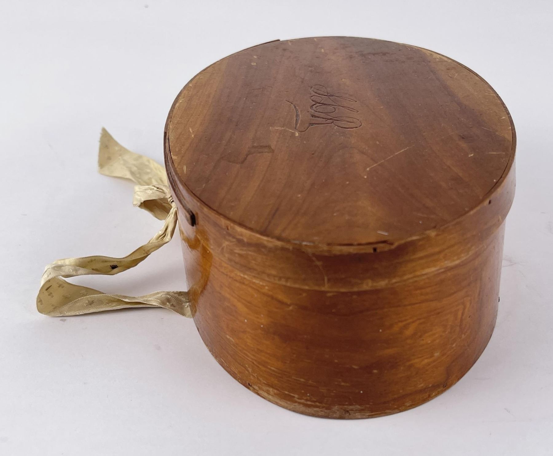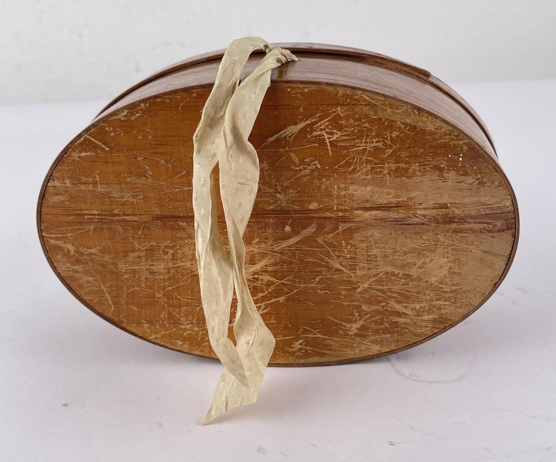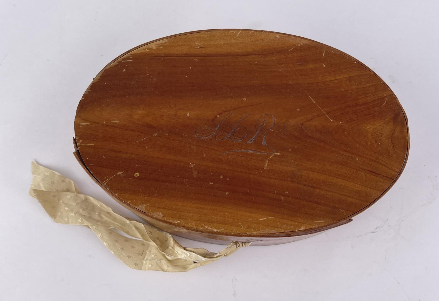 Beautiful old box. Family initials carved into the top. Still retains silk ribbon and lining. 8" long. 3" tall.